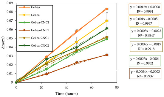 Figure 4 displays the cumulative mass loss of gelatin-based hydrogels that were crosslinked using either glutaraldehyde or citric acid and subsequently reinforced with cellulose nanocrystals (CNC). It is evident that the control formulations exhibited the highest rates of weight loss according to their fitted equations. This makes them more prone to material degradation and indicates a structure with greater affinity for water. Consequently, water diffusion through the film is facilitated, leading to the leaching of soluble components [23]. Additionally, hydrogels containing cellulose nanocrystals (CNC) showed reduced weight loss, with Gel-ga-CNC1 and Gel-ga-CNC2 displaying the lowest values. This behaviour suggests that CNC reinforce the polymer matrix, limiting water penetration and thereby reducing material degradation [24].