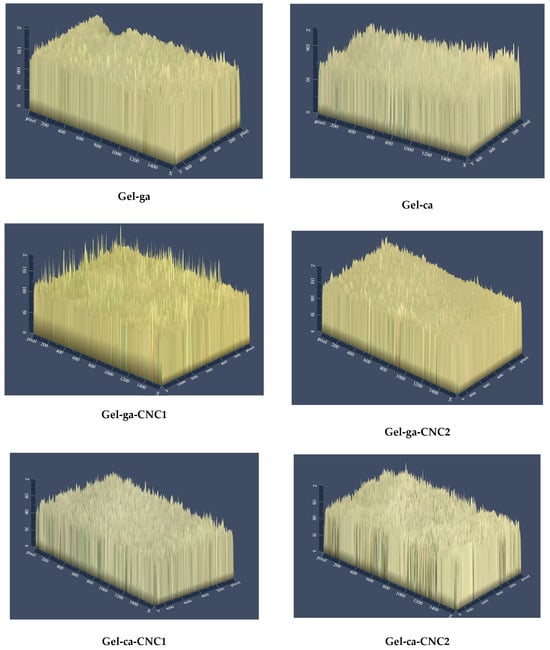 In Figure 5, the 2.5D micrographs show differences (p < 0.05) in the surface topography among the formulations, depending on the crosslinking agent used and the presence of cellulose nanocrystals (CNC). The hydrogels (Gel-ga-CNC1 and Gel-ca) exhibited rougher and more heterogeneous surfaces. In these two formulations, regions with lighter tones were also observed, indicating significant topographical irregularities and an increase in surface roughness. This phenomenon could be attributed to a heterogeneous molecular structure resulting from irregular crosslinking processes or poor compatibility within the polymeric matrix [28]. Conversely, the hydrogels Gel-ga-CNC1 and Gel-ca-CNC1 showed smoother and more uniform surfaces. This greater uniformity may be related to a more organized structure, which benefits barrier properties. Overall, the incorporation of CNC and the type of crosslinking agent directly influence the surface microstructure and functional performance of the material. This aligns with the findings reported by [29], which state that the high density of hydroxyl groups (-OH) on the surface of cellulose nanocrystals (CNC) promotes their aggregation in aqueous media through interparticle hydrogen bonding, forming clusters that are difficult to disperse. This tendency to agglomerate limits their uniform distribution in polymeric matrices. However, surface modification of CNC allows optimization of interfacial interactions in the materials. These results are consistent with the gloss data measured at 60°, where formulations with smoother surfaces, such as Gel-ga (94.80) and Gel-ga-CNC2 (97.80), exhibited higher reflectance. In contrast, those with greater roughness and heterogeneity, such as Gel-ca-CNC1 (31.29) and Gel-ca-CNC2 (33.43), showed significantly lower values. Thus, the correlation between roughness and gloss demonstrates that both the crosslinking agent and CNC distribution directly affect the surface microstructure and, consequently, the optical properties of the material.