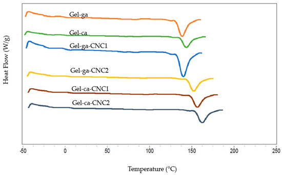 In Figure 8, the differential scanning calorimetry (DSC) curves corresponding to gelatine hydrogels, prepared with different crosslinking agents and cellulose nanocrystal (CNC) concentrations, are presented. Table 4 details the melting temperature and enthalpy values (Tm and ΔHm, respectively) obtained from these thermograms.
