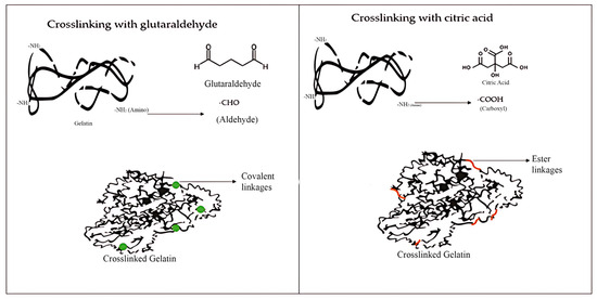 Crosslinking reaction between gelatine with glutaraldehyde and citric acid.