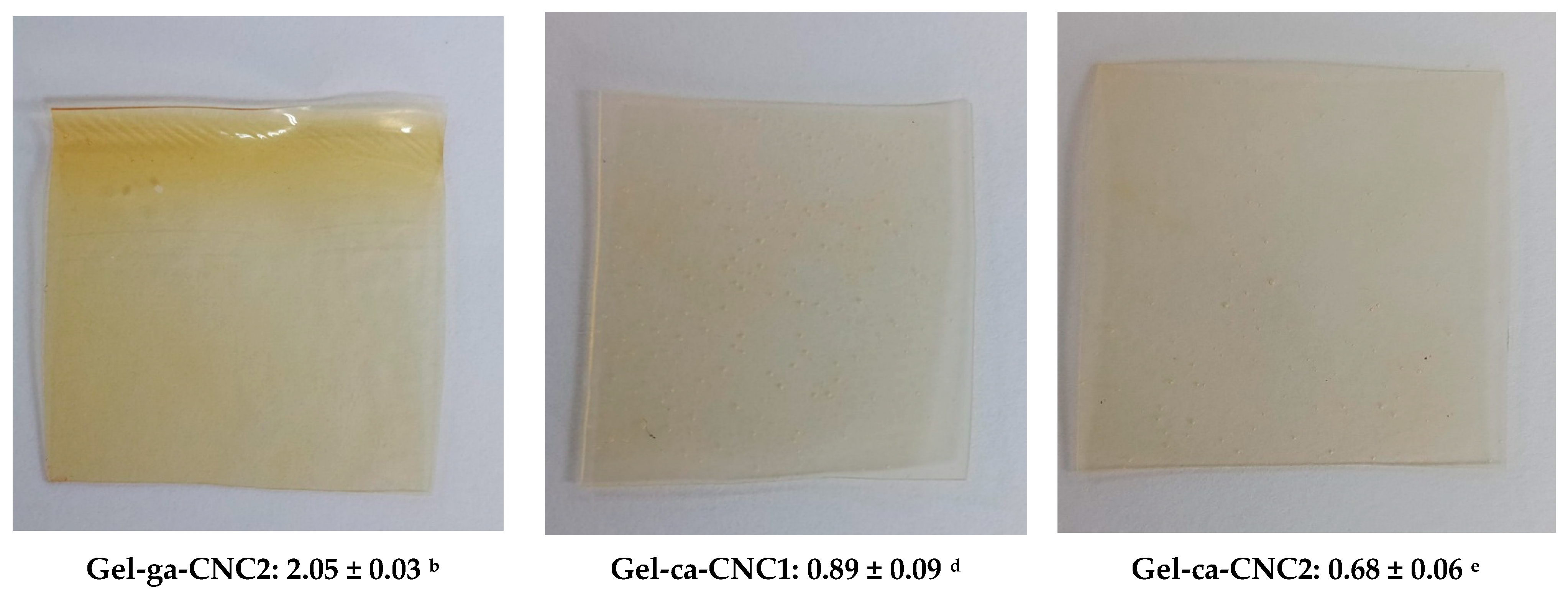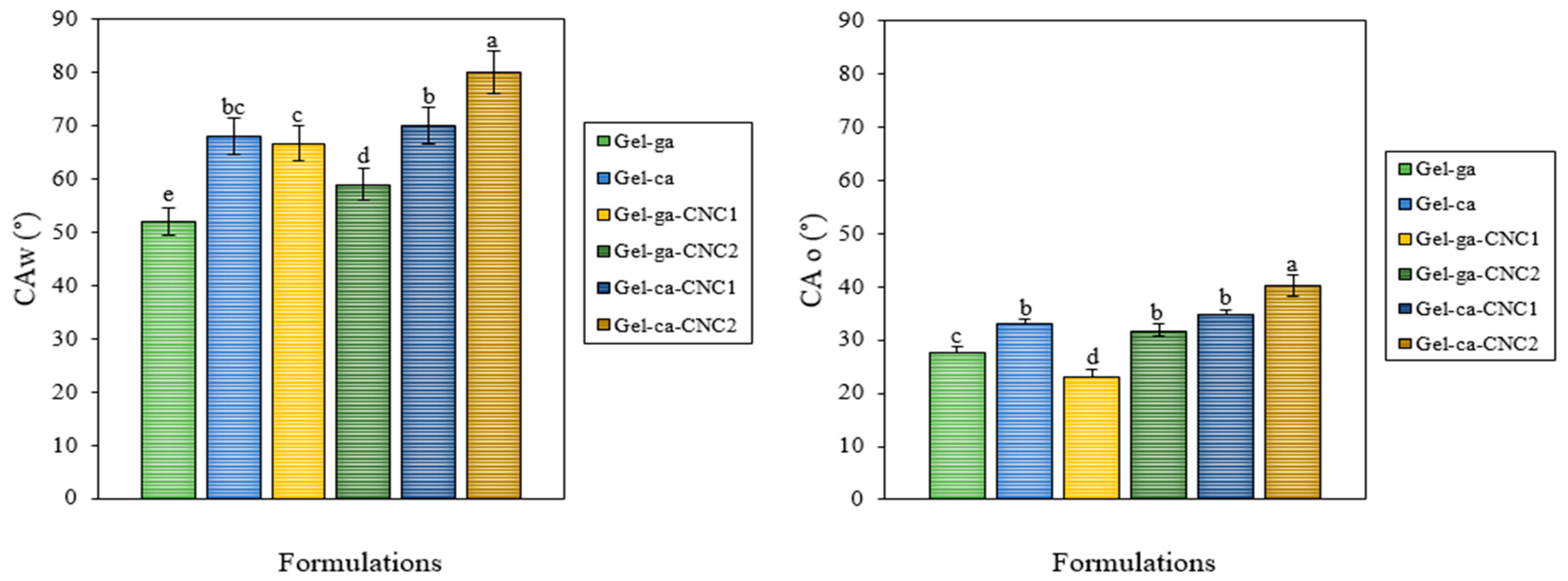 Gel-ga-CNC1 | 78.60 ± 1.43 b | 77.3 ± 0.5 b | 7.8 ± 1.21 a | 47.4 ± 0.5 c | 48.8 ± 0.4 c | 80.0 ± 0.7 b | 8.14 ± 0.3 a | |