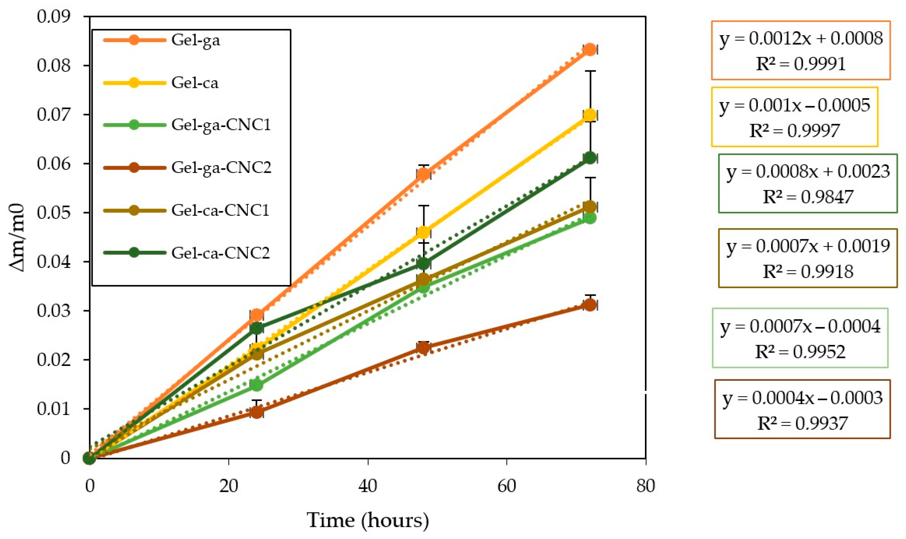 4.3.5. Moisture Content (Xw) and Swelling Degree (Hw) of the Hydrogels