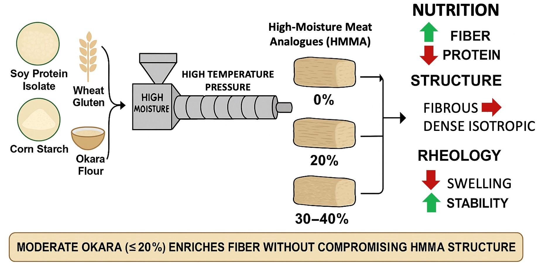 This study demonstrated how okara incorporation (0–40% Okara) modulates the structure–function relationships of high-moisture meat analogues (HMMA). Increasing okara reduced protein density but enriched fiber and fat, producing nutritional gains alongside structural trade-offs. Fibrous anisotropy was retained around 20% Okara but deteriorated at higher levels, leading to dense, isotropic textures.