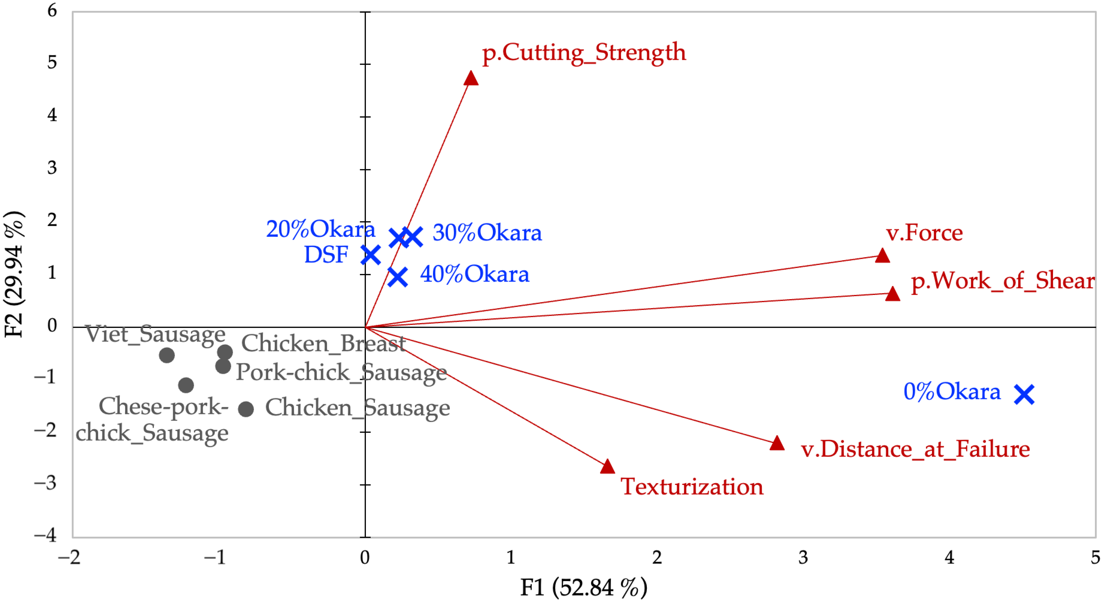 Figure 2. Principal component analysis (PCA) biplot of cutting test texture variables across prototype and commercial samples. The first two principal components (PC1 = 52.84%, PC2 = 29.94%) jointly explain 82.79% of the variance. Active variables (red arrows/triangles) represent loadings for p.Work_of_Shear, p.Cutting_Strength, v.Force, v.Distance_at_Failure, and Texturization. Points represent individual samples. 0% Okara is positioned at the far right with high PC1 scores, reflecting strong firmness and cutting resistance. Commercial sausages cluster in the lower-left quadrant, indicative of soft texture and high deformability. 20–40% Okara and Defatted Soy Flour (DSF) cluster along PC2, reflecting moderate firmness but higher internal cohesion.
