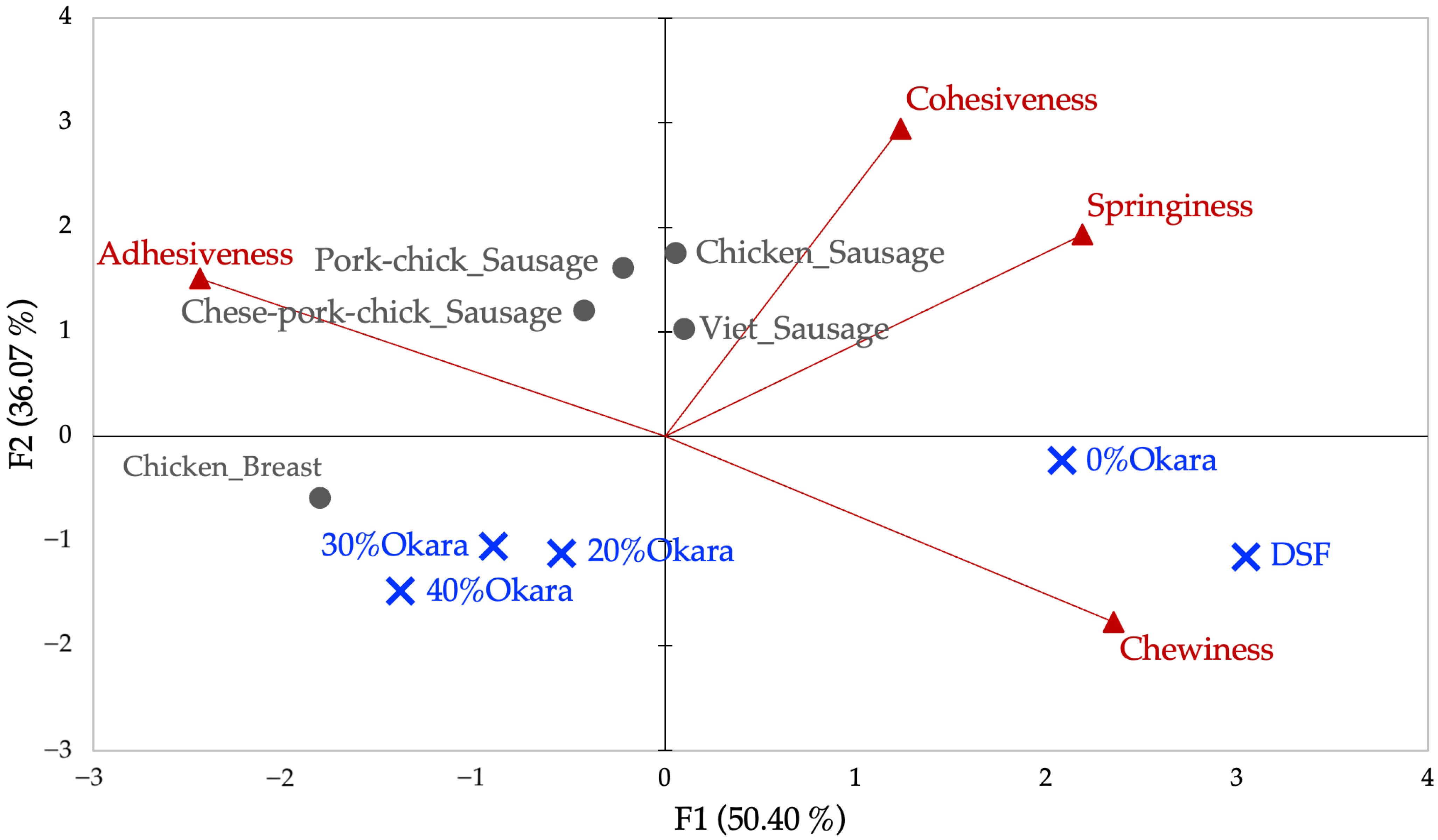 As shown in Figure 3, DSF and 0% Okara plotted to the far right with high chewiness and low adhesiveness, while 20–40% Okara shifted leftward, reflecting softer, more adhesive textures. Among animal products, sausages clustered in the upper quadrants, associated with cohesiveness and springiness, whereas chicken breast occupied a lower position, reflecting fibrous but less cohesive structure.
