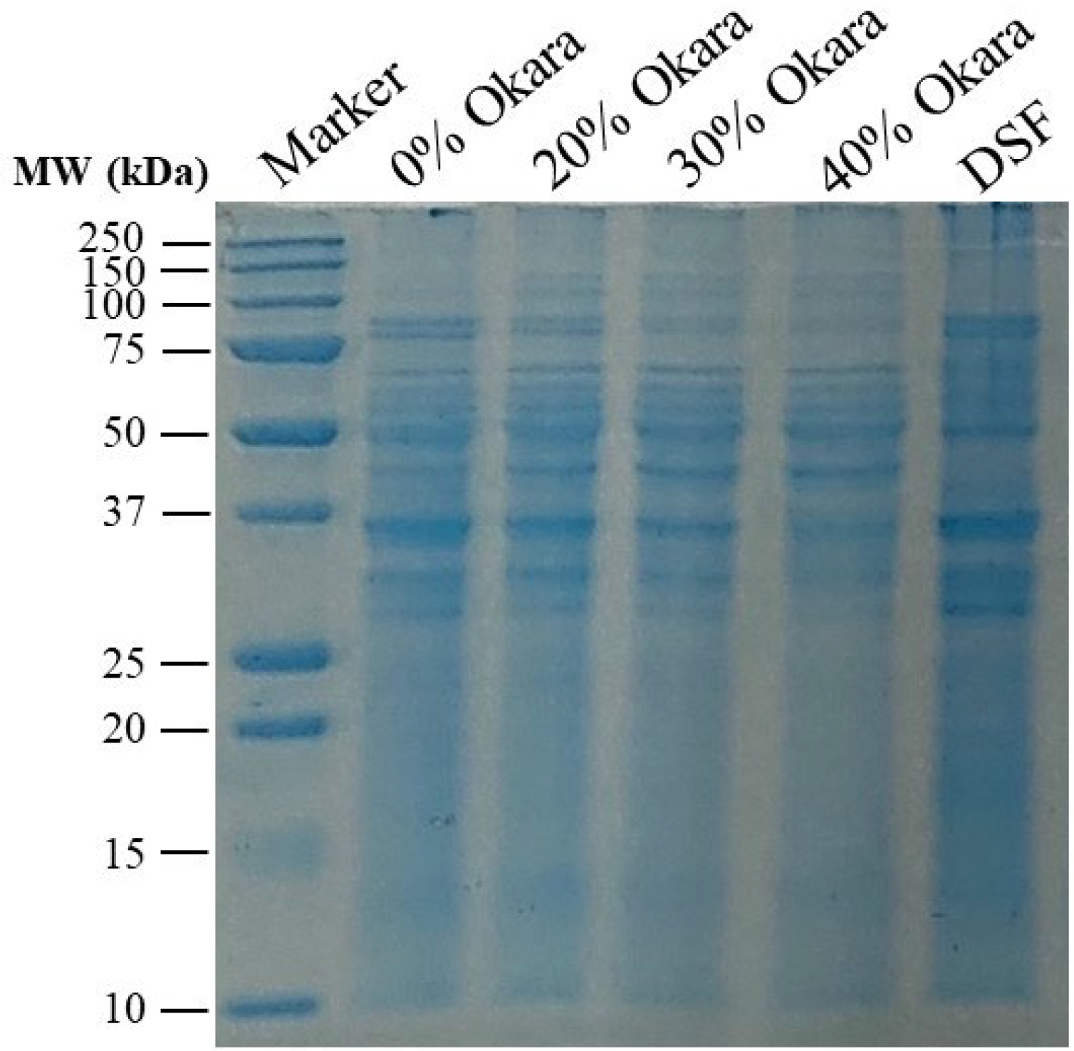 With higher okara incorporation, band intensity decreased progressively. At 20% okara, β-conglycinin bands were weaker, while at 30% the α′ and α bands were faint and acidic glycinin was further diminished. At 40% okara, only traces of β (~50 kDa) and basic glycinin (~20 kDa) remained. These lighter profiles reflect reduced protein purity and solubility compared with DSF.