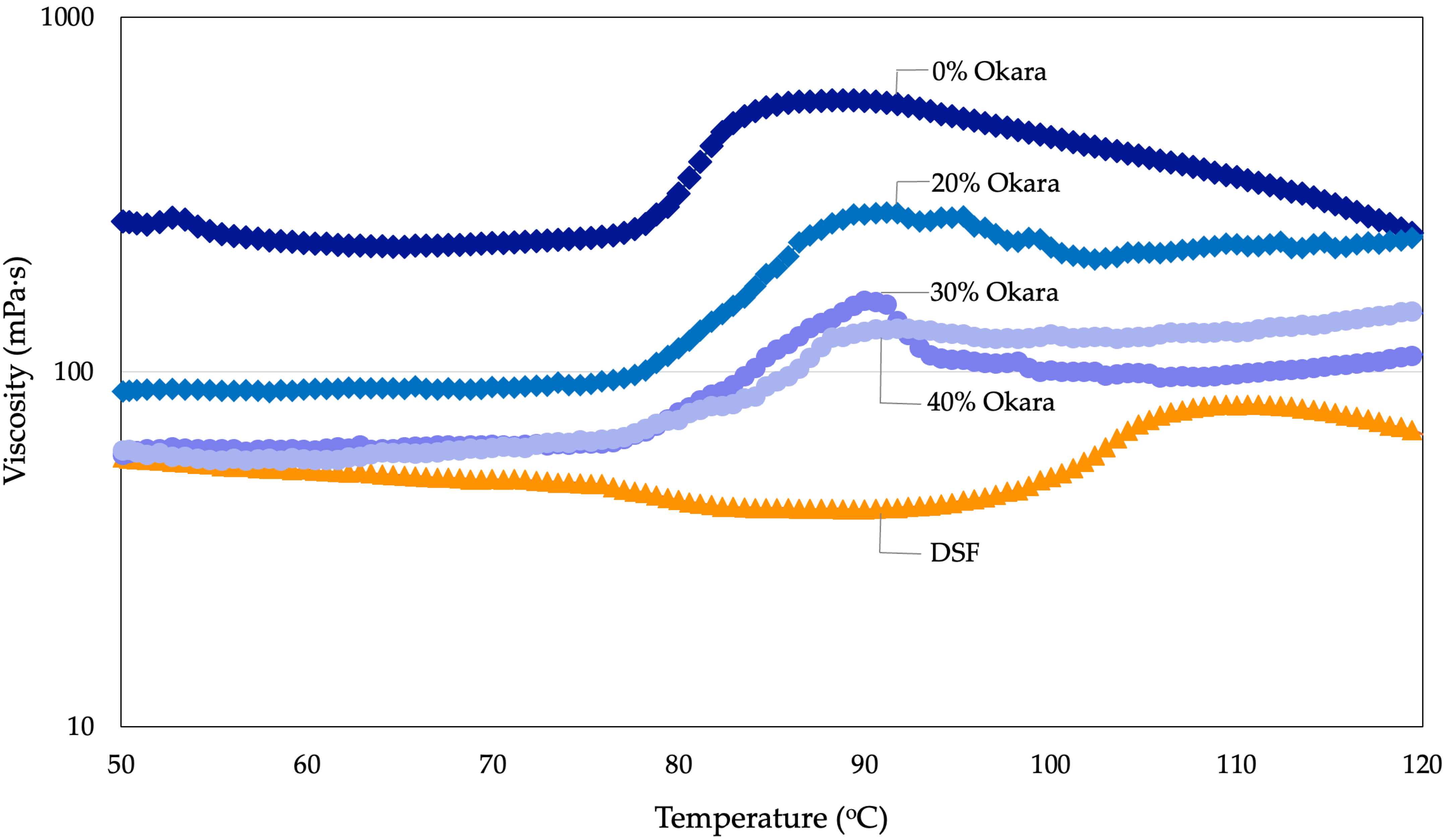 Figure 5. Viscosity–temperature profiles of HMMA flour mixes (0–40% Okara) and defatted soy flour obtained under pressurized conditions (30 bar, 50–120 °C) at a constant shear rate of 200 s−1; apparent viscosity (mPa·s). The starch-rich 0% Okara mix showed the most pronounced gelatinization peak, while okara-containing blends exhibited progressively flatter, more stable curves. DSF showed minimal viscosity development due to its low starch content.