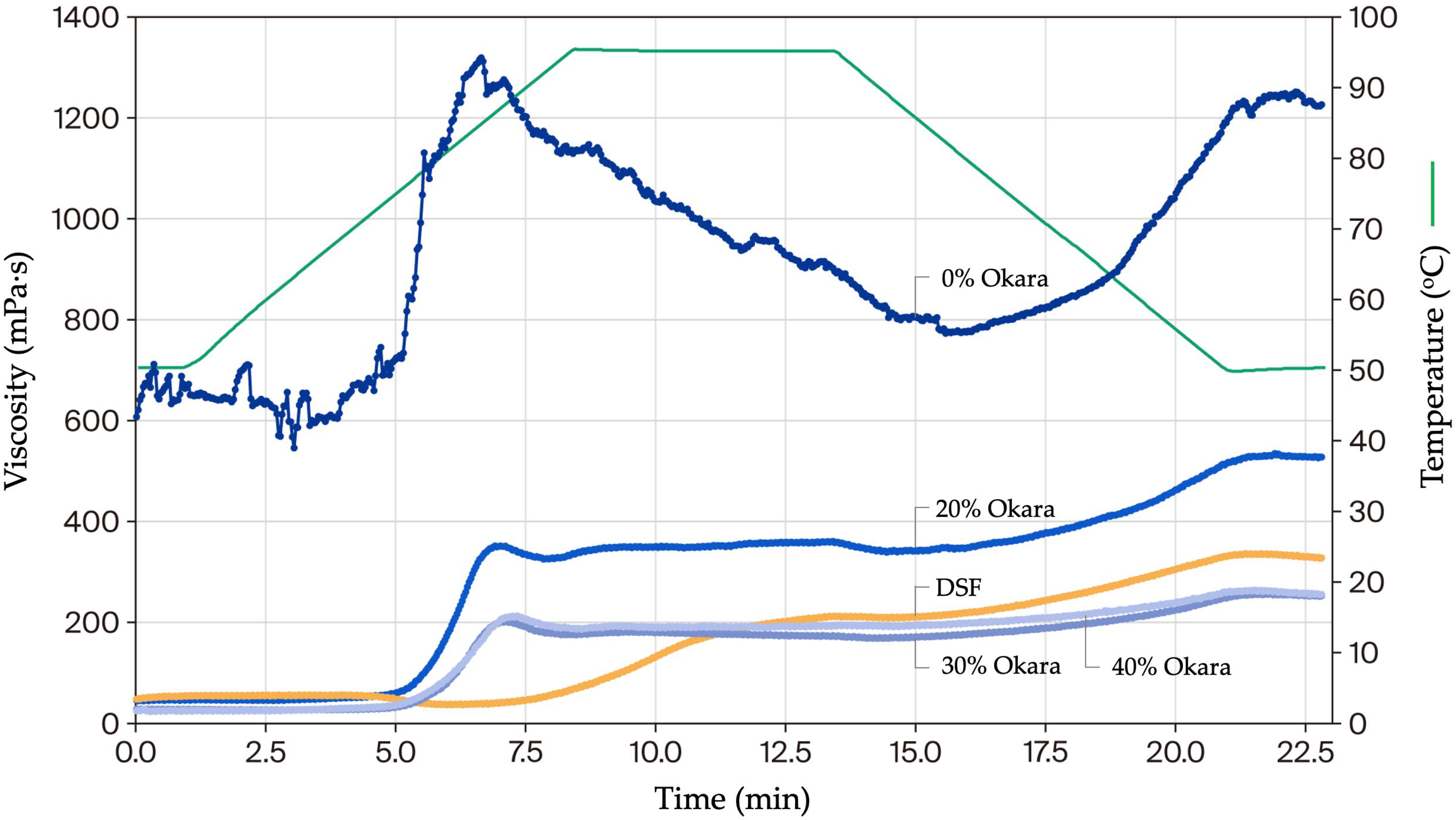 Figure 6. Viscosity–time profiles of HMMA flour mixes (0–40% Okara) and defatted soy flour from the RVA-like atmospheric test (50–95–50 °C). The 0% Okara control displayed a sharp peak and setback, whereas increasing okara incorporation dampened swelling and retrogradation. DSF produced weak viscosity development characteristic of protein-dominated systems.