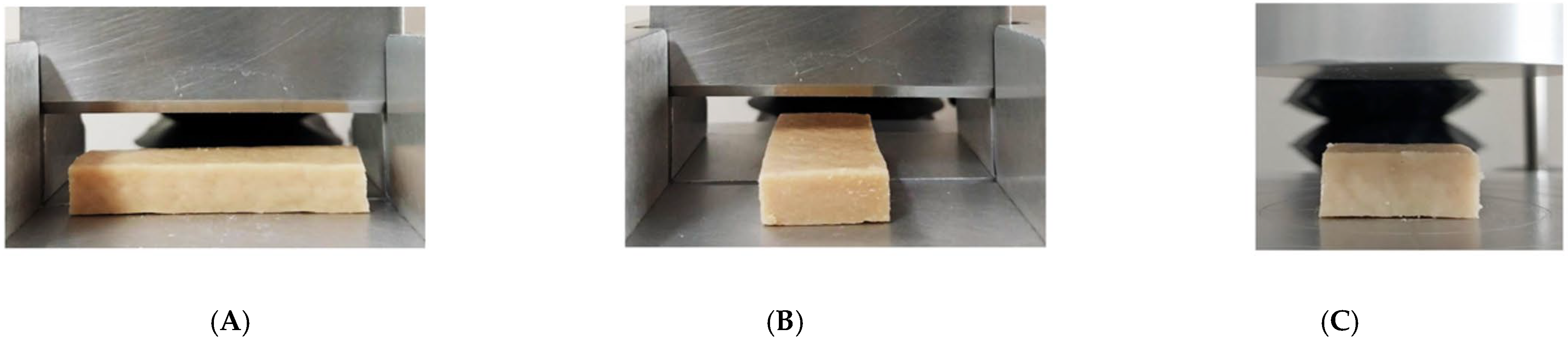 Figure 9. Experimental setups for texture analysis of HMMAs. (A) Longitudinal cutting (parallel to extrusion flow). (B) Transverse cutting (perpendicular to extrusion flow). (C) Texture profile analysis (TPA) using a cylindrical probe during double compression.