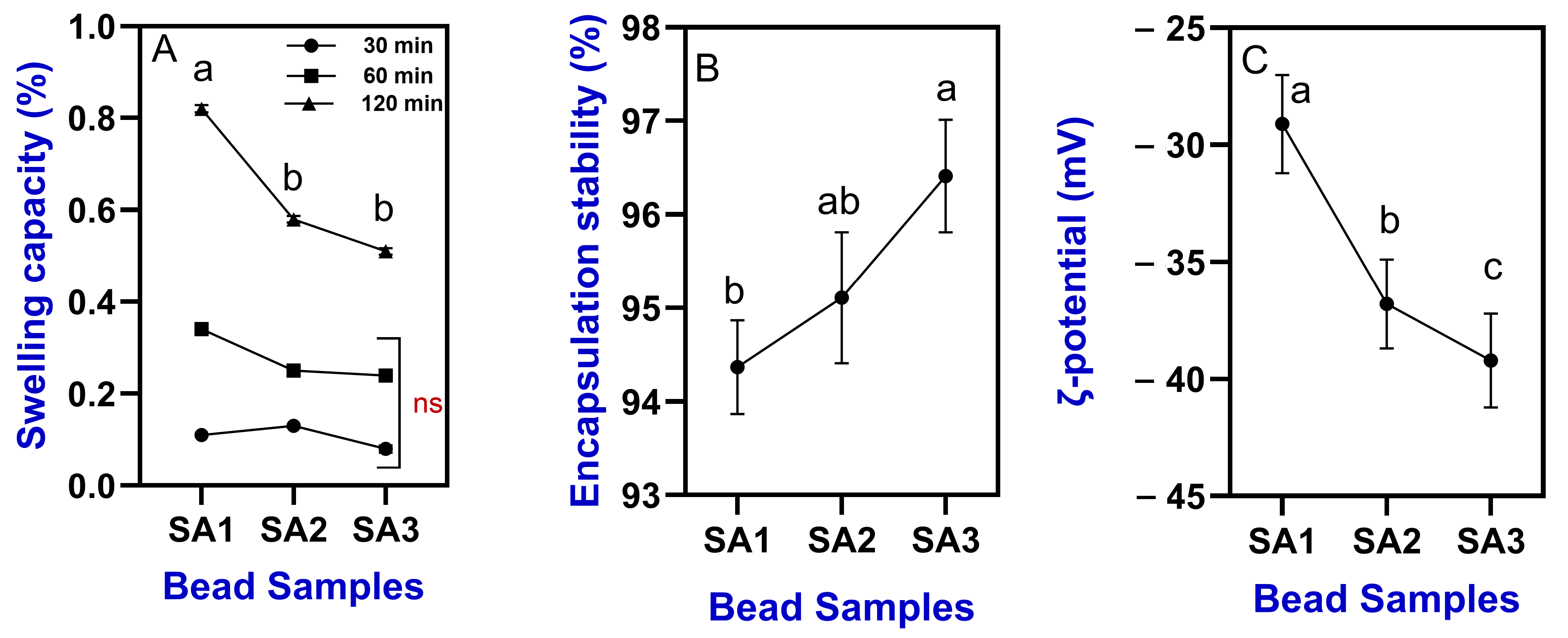 2.2.3. Swelling Capacity and Encapsulation Stability