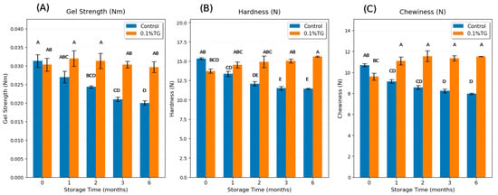 Gel strength (A), hardness (B), and chewiness (C) results of control FSC surimi samples (blue) and 0.1 wt% TG-added FSC surimi samples (orange) along with frozen storage time. Uppercase letters on error bars show the significant differences (p < 0.05).