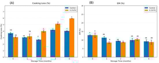 Cooking Loss (A) and EM (B) results of control FSC surimi samples (blue) and 0.1 wt% TG-added FSC surimi samples (orange) along with frozen storage time. Uppercase letters on error bars show the significant differences (p < 0.05).