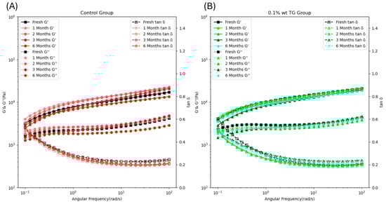 The storage modulus (G′) (solid line with solid marker), loss modulus (G″) (dashed line with solid marker), and the tan б (dashed line with hollow marker) of the control FSC paste samples (A) and 0.1 wt% TG-added FSC paste samples (B) along with frozen storage time.