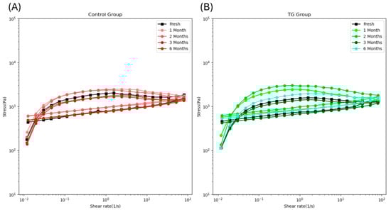 Shear-thinning behavior refers to decreased viscosity with increasing shear rate []. In 3D printing, viscosity plays a critical role: if the food ink is too viscous, it cannot pass smoothly through the nozzle, whereas the liquid-like food with low viscosity fails to maintain its printed shape. Therefore, selecting a suitable viscosity range is essential for 3D printing operations. Figure 5 shows that all samples exhibited shear-thinning behavior once the shear rate exceeded 0.025 s−1. At the same shear rate, the viscosity of the control samples increased from fresh to 2-month frozen storage, then dropped back after extended frozen storage (Figure 5A). In Figure 5B, the viscosity of the 0.1 wt% TG-added samples increased from fresh to 1-month frozen storage, then returned to the fresh level. These results are consistent with the finding that short-term frozen storage can increase the viscosity of myofibrillar protein [], thereby improving control of FSC paste viscosity for use as food ink.