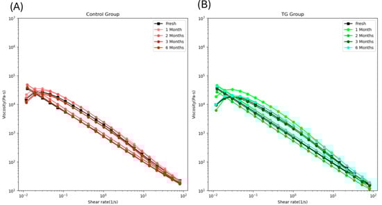 The viscosity loop of the control FSC paste samples (A) and 0.1 wt% TG-added FSC paste samples (B) along with frozen storage time.