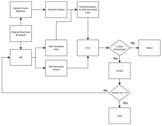 - Validation Loop: If absolute error ≤ τ, the x_new and y_new were deemed consistent with the RFR’s understanding of the input-output relationship and were accepted. If absolute error > τ, the y_new was rejected, as the discrepancy between the KDE-generated output and the RFR-predicted output is too large, and returned to step 2;