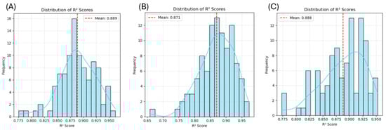 The distribution of R2 for the Random Forest model with the mixed dataset of gel strength (A), hardness (B), and chewiness (C).