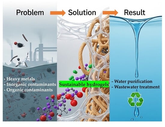 - Nawaz, A.; Zahid, M.; Rehman, A.; Mansha, A.; Hussain, T. Chapter 14—Sustainable Hydrogels as an Emerging Material Platform for Water Purification. In Sustainable Hydrogels; Thomas, S., Sharma, B., Jain, P., Shekhar, S., Eds.; Elsevier: Amsterdam, The Netherlands, 2023; pp. 375–395. ISBN 978-0-323-91753-7. [Google Scholar]
