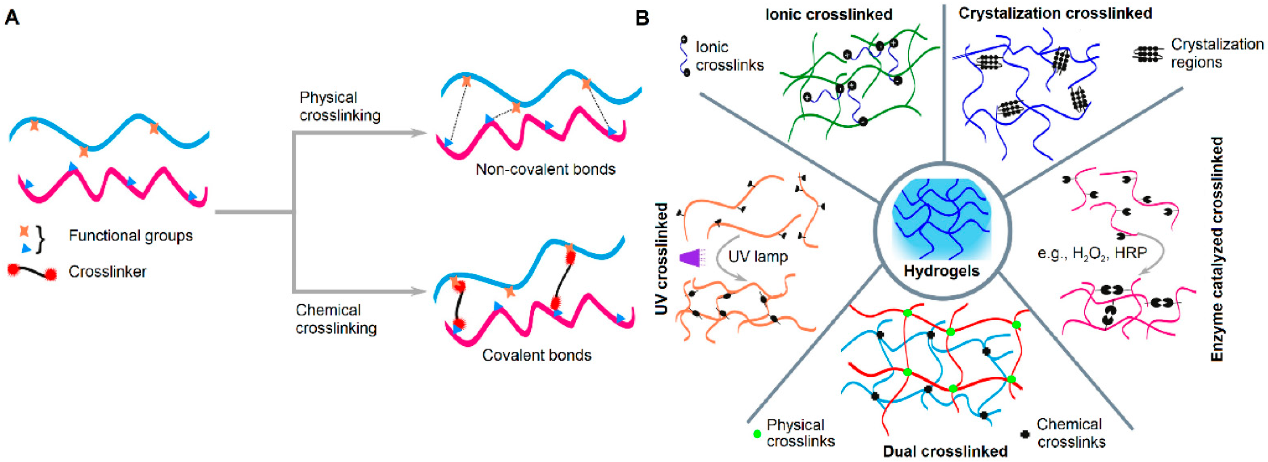 - Stability and reusability: Physically crosslinked hydrogels are reversible and less stable, making them suitable for applications like on-demand drug release. Chemically crosslinked hydrogels are irreversible and highly stable, making them ideal for long-term biomedical or industrial use [16,21,24,25].