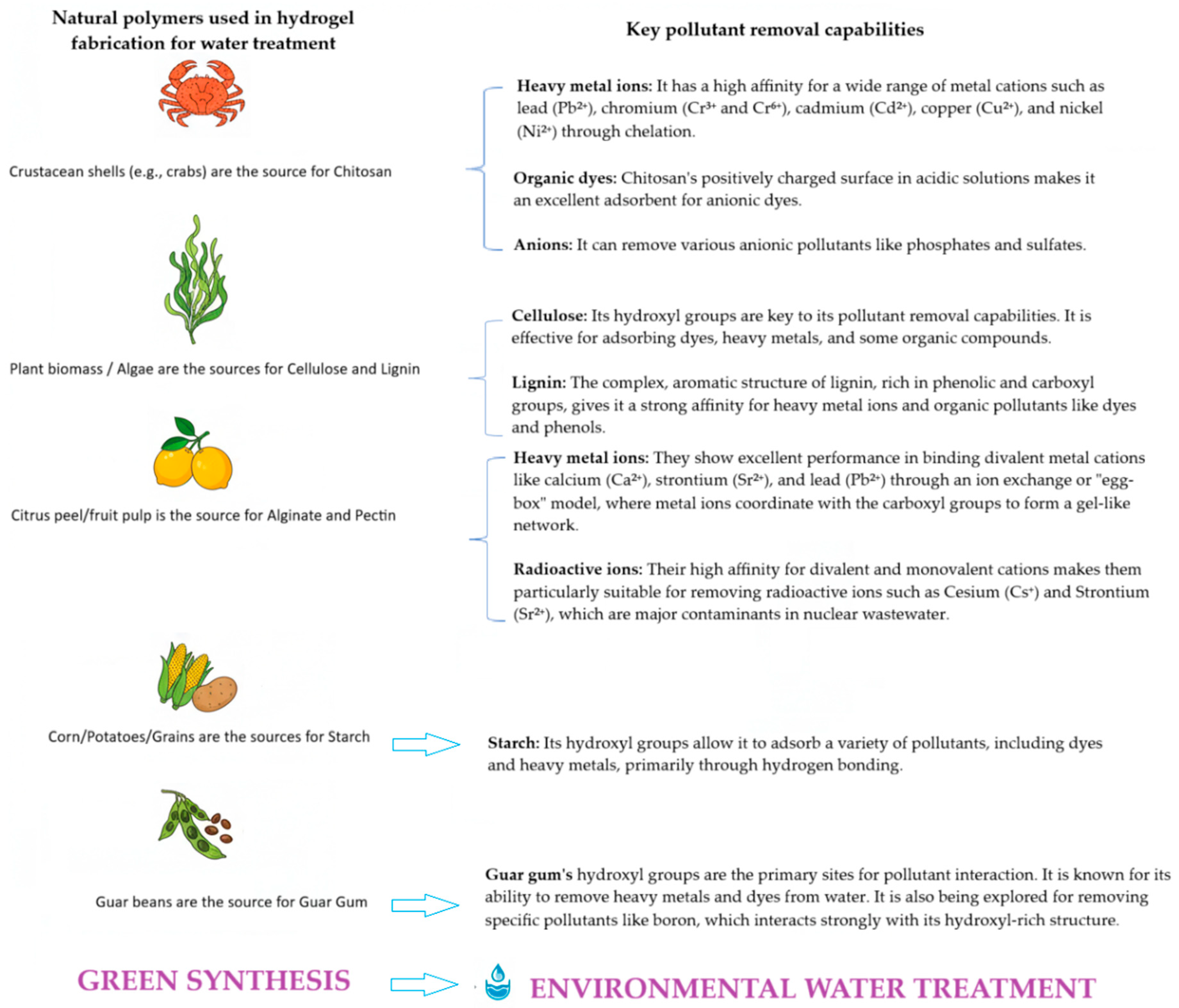 Guar gum | Guar beans | Numerous hydroxyl (-OH) groups | Heavy metals, dyes, and specific pollutants like boron. Its hydroxyl groups facilitate adsorption through hydrogen bonding and complexation | ✓ It is a low-cost, food-grade natural product that is biodegradable and non-toxic. Its production is relatively simple and requires less energy compared to synthetic polymers. ✗ Guar gum-based hydrogels may have lower mechanical stability in certain conditions and can be susceptible to microbial degradation, which could limit their long-term use in some applications. | [33] |
