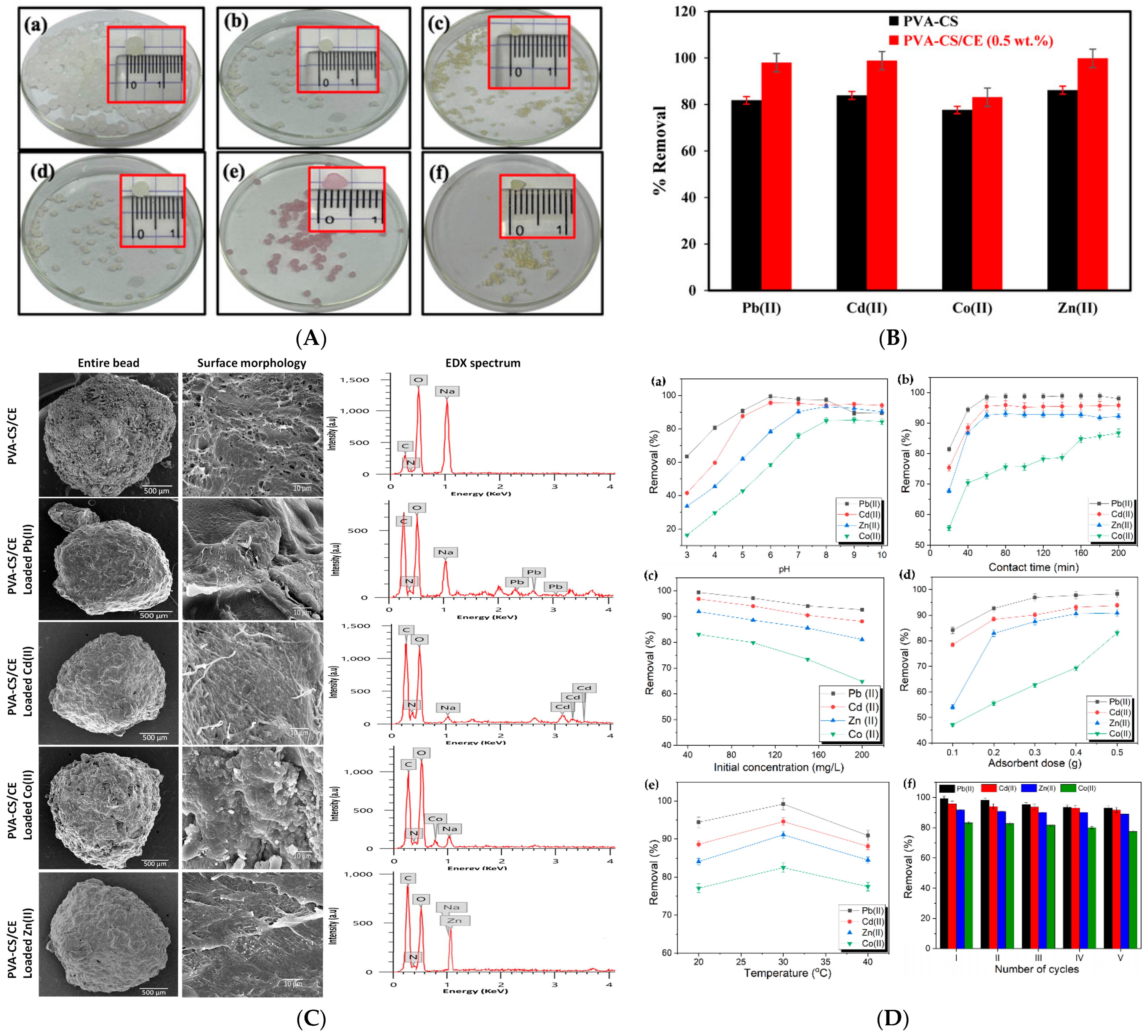PVA | Synthetic | –OH | Broad-spectrum (e.g., heavy metals Ni2+, Cu2+, Co2+, Cr6+), dyes, radionuclides | ✓ High durability, tunable properties; ✗ Slow biodegradation, petroleum-derived | [86] |