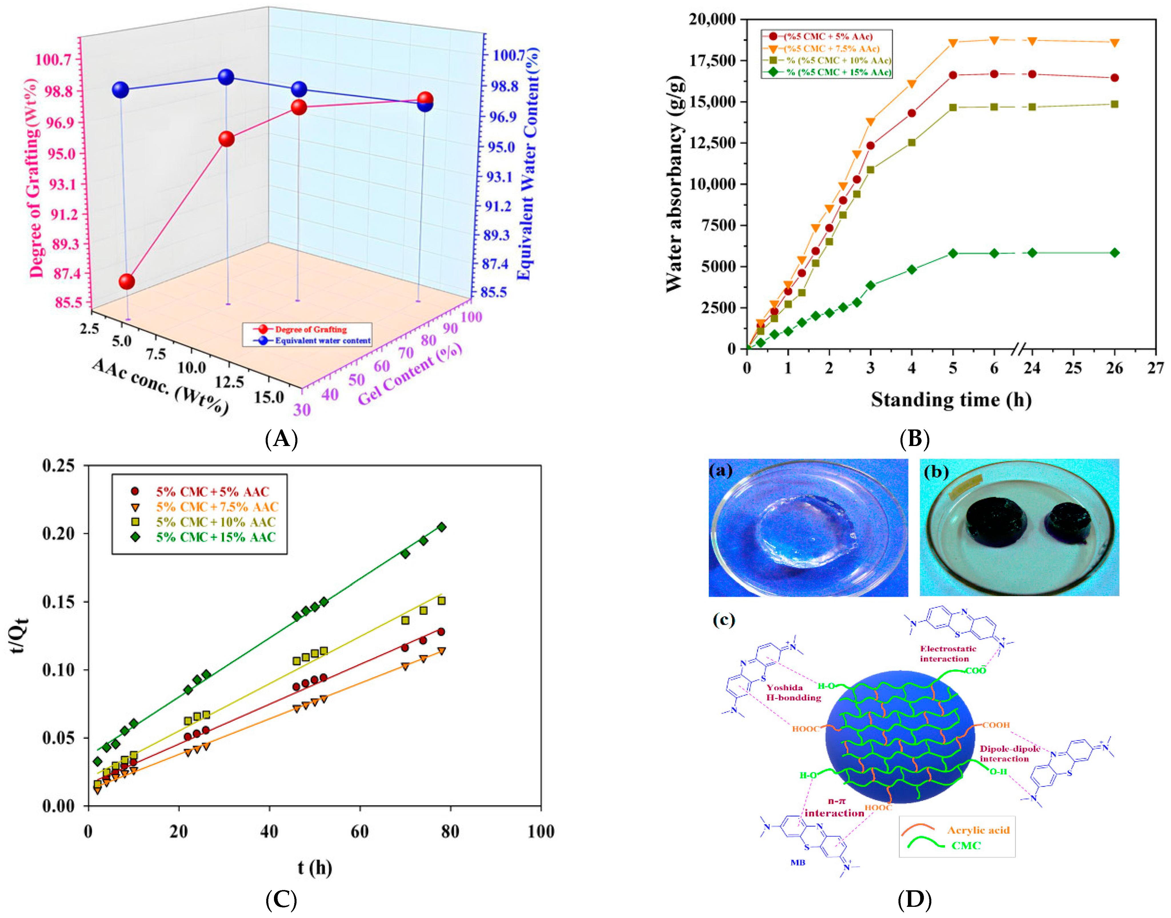 - El-saied, H.A.; El-Fawal, E.M. Green Superabsorbent Nanocomposite Hydrogels for High-Efficiency Adsorption and Photo-Degradation/Reduction of Toxic Pollutants from Waste Water. Polym. Test. 2021, 97, 107134. [Google Scholar] [CrossRef]