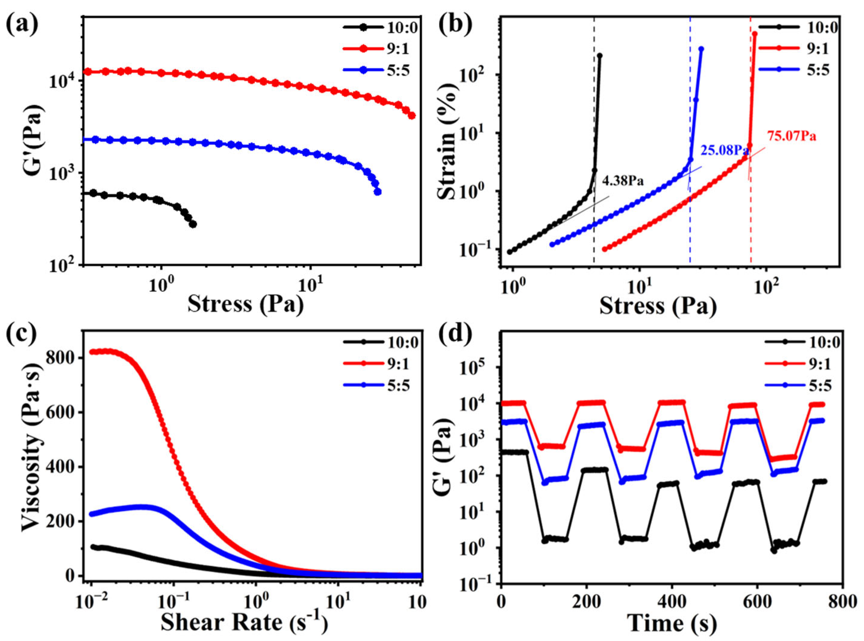 - Yang, Z.; Li, Y.; Shen, C.; Chen, Y.; Li, H.; Zhou, A.; Liu, K. Tuning Rheological Behaviors of Supramolecular Aqueous Gels via Charge Transfer Interactions. Langmuir 2021, 37, 14713–14723. [Google Scholar] [CrossRef] [PubMed]