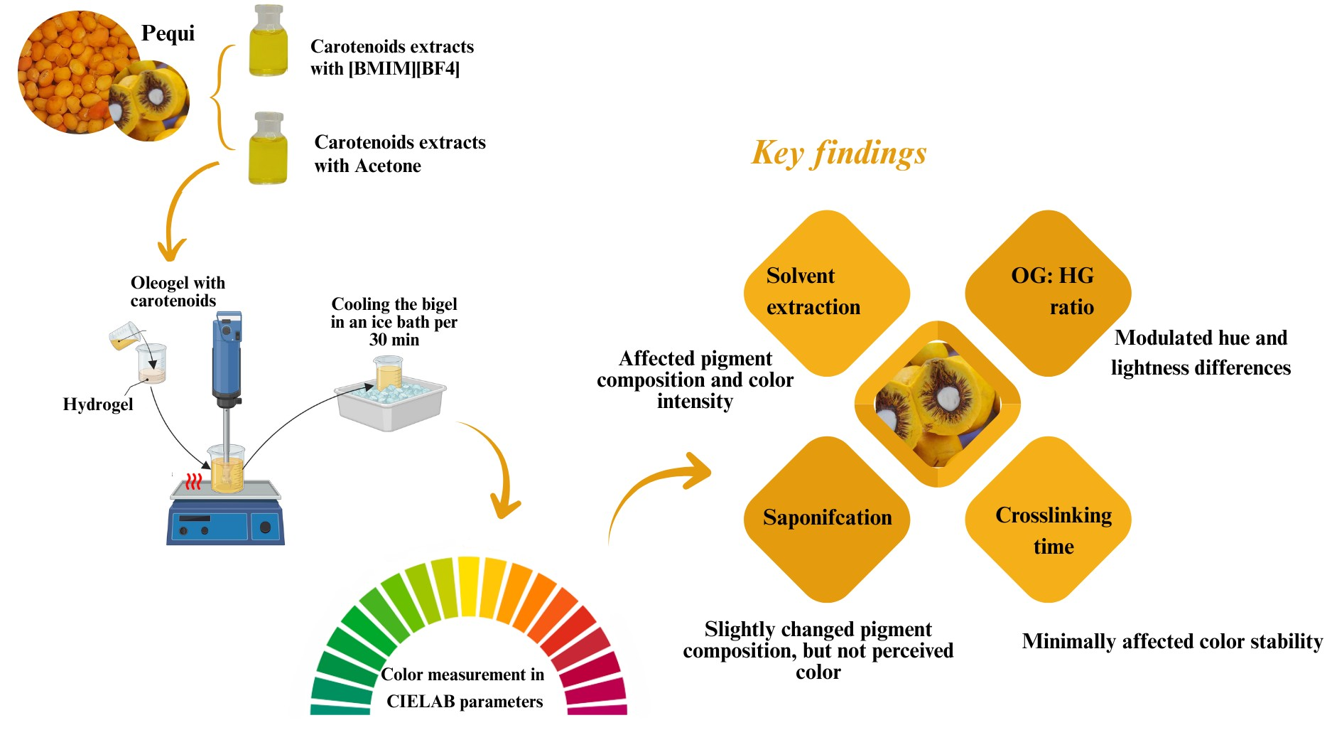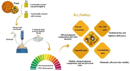 Ramos-Souza, C.; Bandoni, D.H.; de Rosso, V.V. Color Development in Carotenoid-Enriched Bigels: Effects of Extraction Method, Saponification, and Oleogel-to-Hydrogel Ratios on CIELAB Parameters. Gels 2025, 11, 823. https://doi.org/10.3390/gels11100823