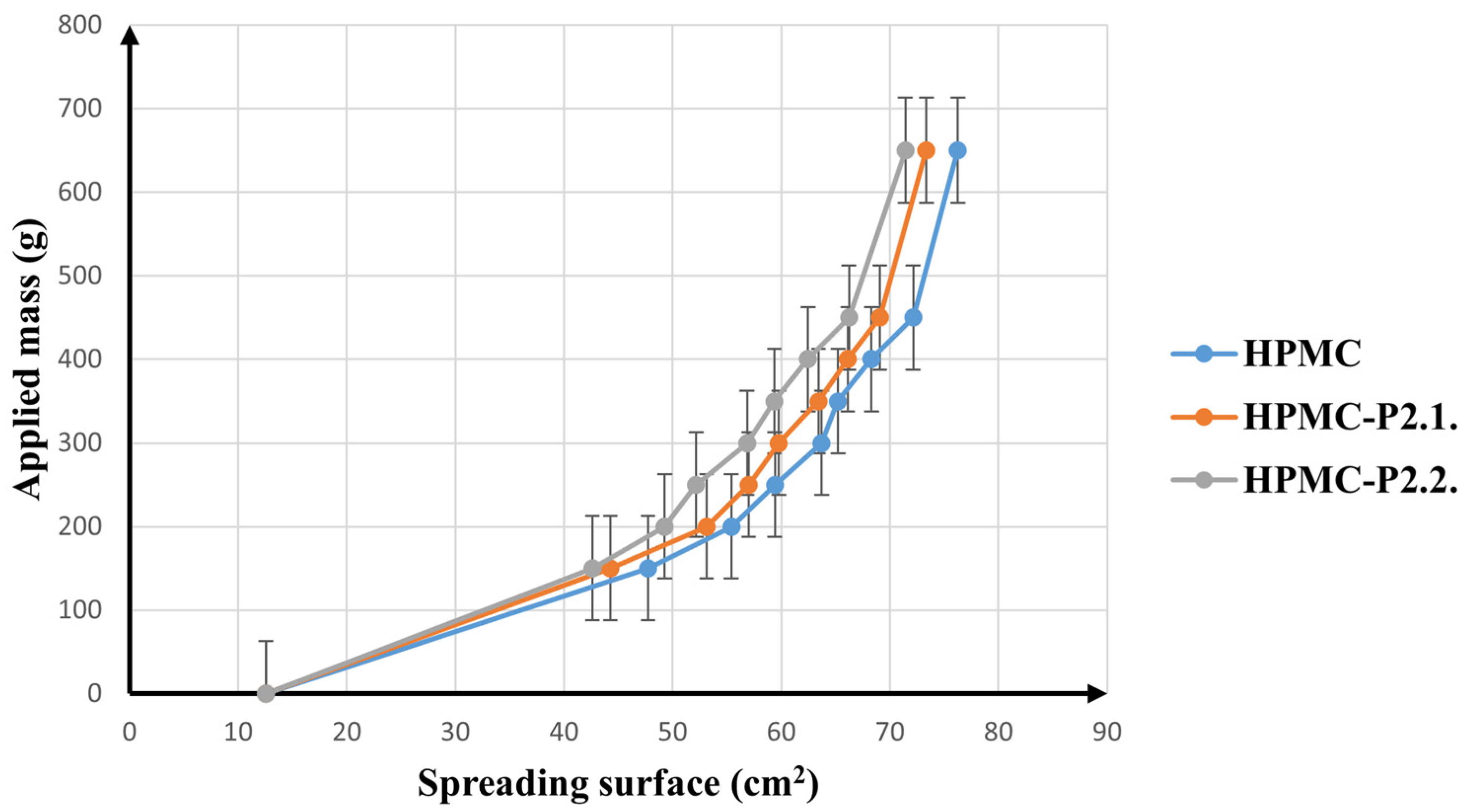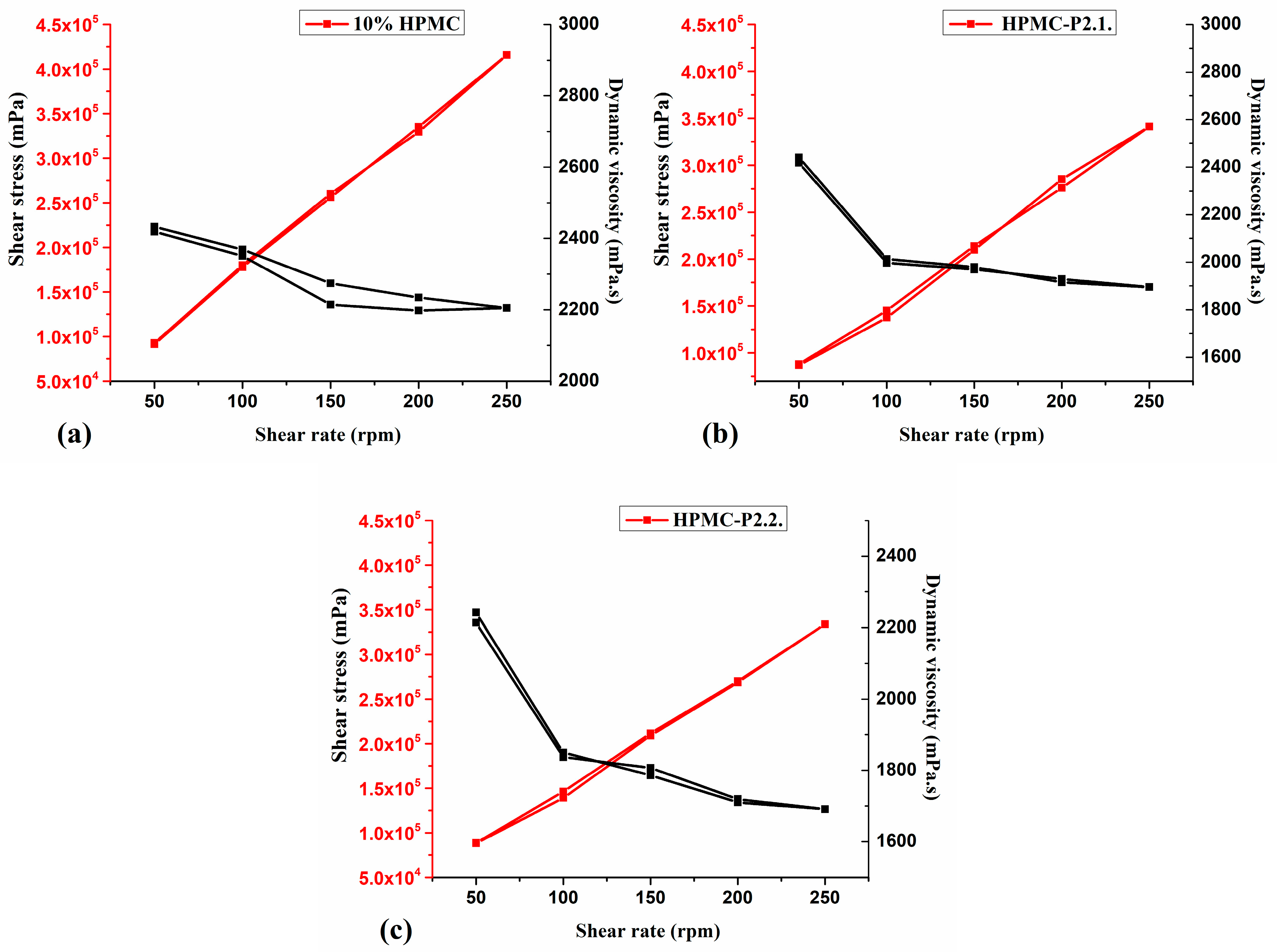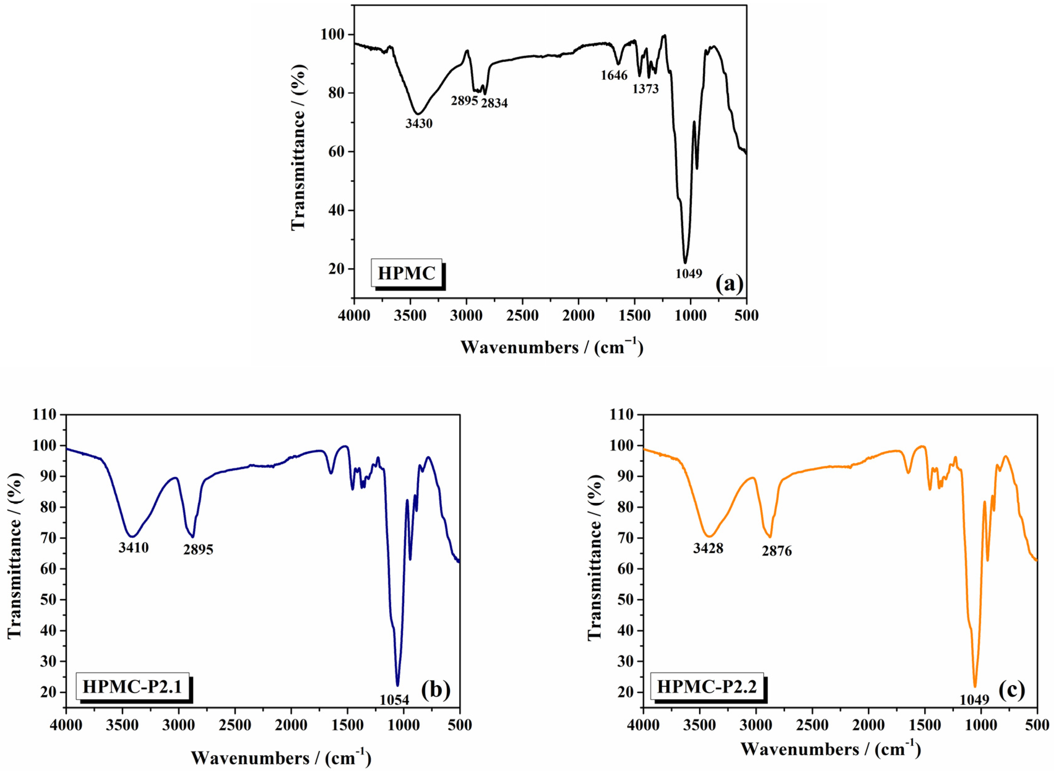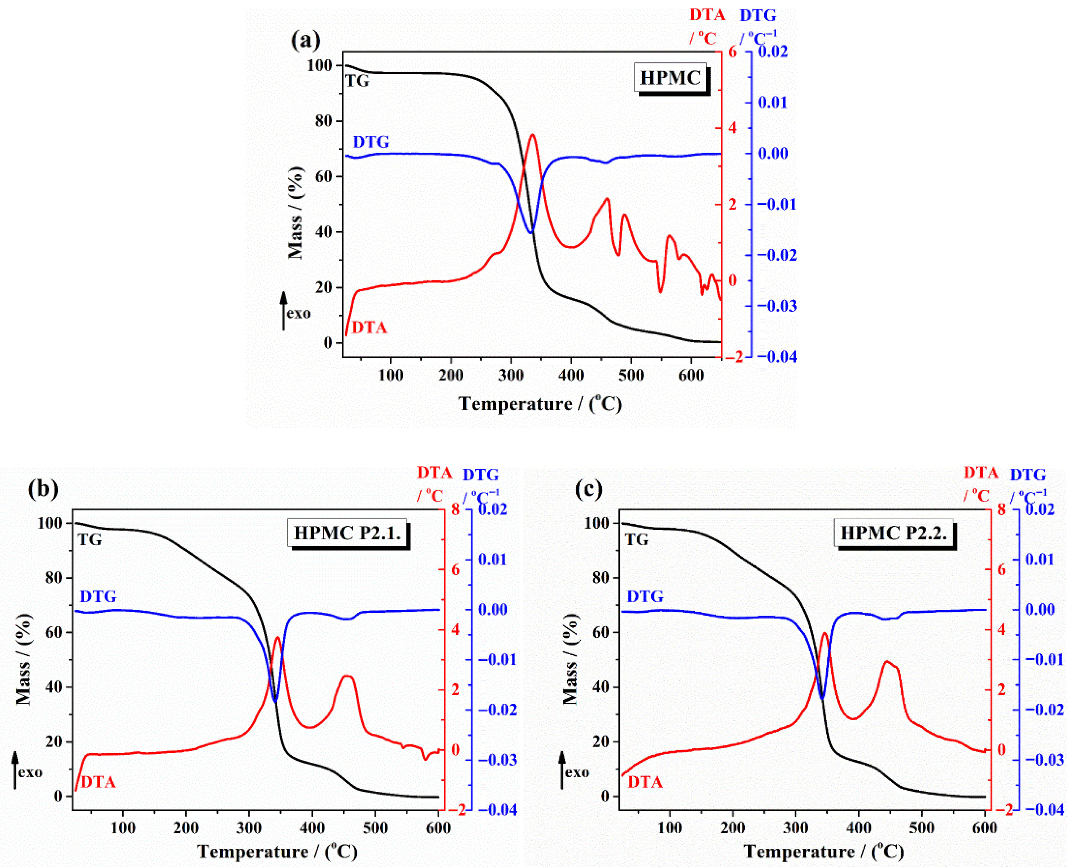 | HPMC-P2.2 | Below 100 °C/2% | TDTA = 342.6 °C and TDTG = 346.5 °C TDTA = 447 °C and TDTG = 443 °C | No residue |