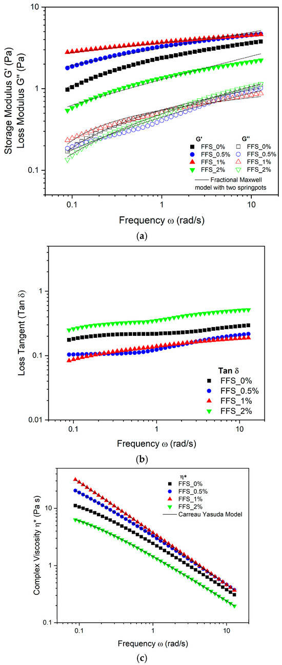 The rheological characterization of FFS was performed using a modular advanced rheometer system Mars 60, Haake (Thermo Scientific, Karlsruhe, Germany), equipped with a serrated plate-plate geometry (35 mm diameter and 0.5 mm diameter GAP) to prevent slip effects. Samples were allowed to equilibrate for 300 s prior to the rheological characterization to ensure uniform thermal and mechanical history.