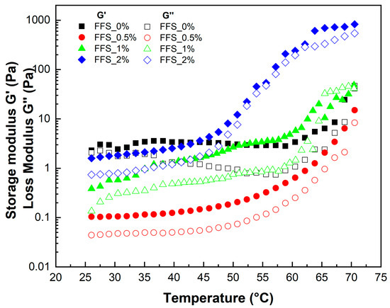 The temperature-dependent viscoelastic properties are shown in Figure 2. Across the entire temperature range studied (25 °C to 70 °C), all FFS formulations with MPE behaved as gels, as evidenced by values remaining greater than values. Both moduli increased with temperature, suggesting a reinforcement of the polymeric structure as the gel matrix transitions from a weak to a stiff state during heating. This is likely due to the strengthening of leached amylose by starch granules [60]. Parameters from the temperature sweep are listed in Table 4. The sol–gel transition temperature (Ts) ranged from 58.94 °C to 62.58 °C for the 0%, 0.5%, and 1% MPE formulations. However, for FFS_2%, the Ts value was significantly lower at 42.79 °C, indicating that a 2% MPE concentration lowers the gelation point. This may be attributed to MKS chains organizing around the MPE to form a cubic structure, which alters the reinforcement temperature of the gel matrix [61]. In such a structure, dispersed water molecules provide volume and plasticity. Upon heating, water loss from the system causes an increase in both and moduli [62]. This effect enhances the elasticity of the FFS, as higher temperatures reduce hydrogen bonding and accelerate polymer chain movement by removing solvating water molecules [63].