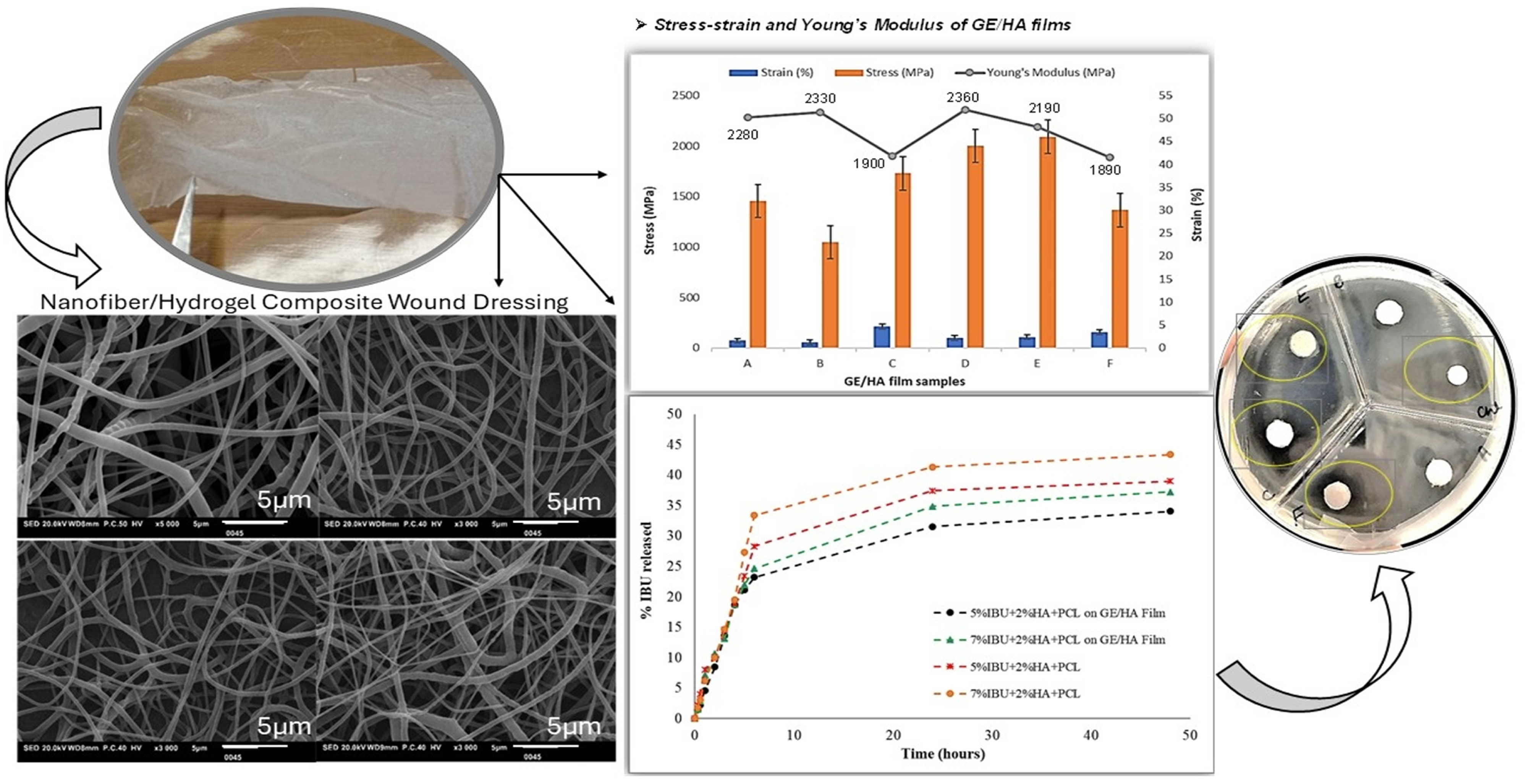 Electrospun fiber-in/on -film composites | phenytoin | Ethyl cellulose | Tailorable in vitro drug release | Release profiles | Wound healing | [79] |