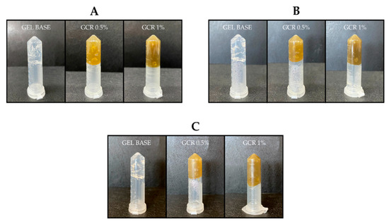 To evaluate bioactive compounds in the gel, phenolic and flavonoid compounds were quantified following the methods described by Djeridane et al. []. The results are expressed as milligrams of gallic acid (Merck KGaA, Darmstadt, Germany) equivalent per gram of extract (mg GAE/g) for phenolic compounds and milligrams of rutin (Merck KGaA, Darmstadt, Germany) equivalent per gram of extract (mg RE/g) for flavonoids. The gels were assessed under different storage conditions (8 °C, 25 °C, and 40 °C) on days 0, 15, 30, 45, 60, 75, and 90.