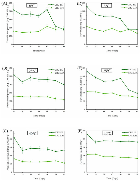 Overall, all investigated treatments showed a reduction in phenolic and flavonoid content (Figure 3). The reduction was more evident with Cochlospermum regium gel containing 1% extract (CRG 1%), whose phenolic and flavonoid content decreased to the same level as Cochlospermum regium gel containing 0.5% extract (CRG 0.5%) after 90 and 75 days, respectively, when stored at 8 °C in a refrigerator. Stability may vary depending on the compound and its interactions [,]; high phenolic compound content may promote the formation of aggregates or reactions, further compromising formulation stability [].
