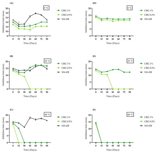 Effect of CRG 0.5% and CRG 1% at different times and storage conditions on the growth of MSSA ATCC 29213 (A–C) and MRSA (D–F). Inhibition halos expressed in mm. CRG: Gel of Cochlospermum regium. SN + ZB: Neomycin sulfate (5 mg/g) + Zinc bacitracin (250 µL/g). Kruskal–Wallis test (p < 0.0001) followed by Dunn’s post hoc test (p < 0.05).