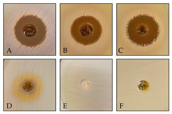 Agar well diffusion assay demonstrating the antibacterial activity of the samples against MRSA. (A) CRG 1% on day 0; (B) CRG 1% stored at 8 °C for 90 days; (C) CRG 1% stored at 25 °C for 90 days; (D) CRG 1% stored at 40 °C for 15 days; (E) Neomycin sulfate (5 mg/g) + Zinc bacitracin (250 µL/g); (F) Base Gel.