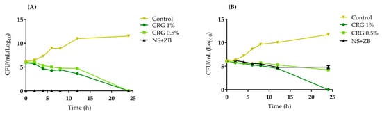 Time-kill curve of MSSA ATCC 29213 (A) and MRSA (B) in the presence of CRG 0.5% and CRG 1%. Two-way ANOVA (p < 0.0001) followed by Tukey’s post hoc test (p < 0.05).