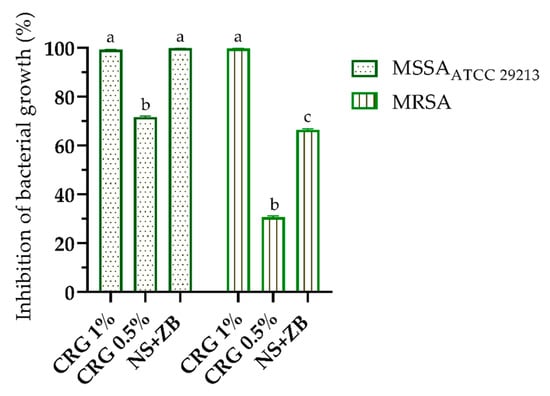 Similar to previous antibacterial results, the kill curve profiles for MSSA and the clinical MRSA isolate at specific time intervals are presented in Figure 6. After 24 h of incubation, both gels (0.5% and 1% CRG) exhibited bactericidal effects against MSSA. Regarding MRSA, only CRG 1% demonstrated this effect, which stood out compared to the NS + ZB control, the latter having no bactericidal efficacy.