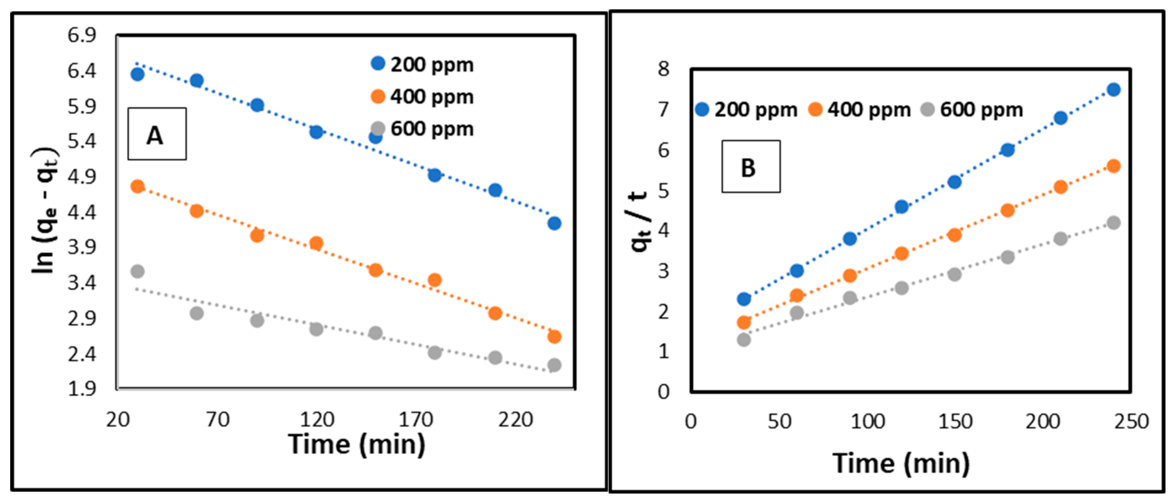 | Co (mg/L) | qe, exp (mg/g) | Pseudo-First Order | Pseudo-Second Order | ||||
