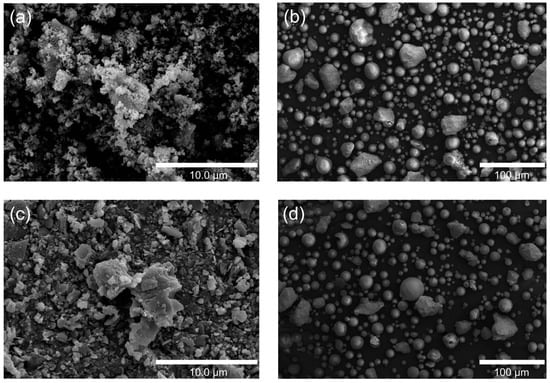 SEM images of HA/TiO2–1%: (a) as-sprayed powders and (b) in-flight particles, and HA/TiO2–5%: (c) as-sprayed powders and (d) in-flight particles.