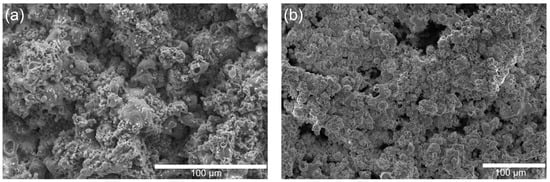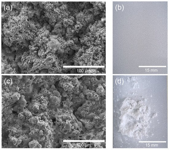 The SEM images of the as-sprayed coatings (Figure 2a,c) display a rough, particulate surface with interconnected micro- and submicron-sized pores, typical of flame-sprayed HA/TiO2 deposits. Such morphology is beneficial, as it increases surface area and provides anchoring sites for subsequent hydrogel attachment. After immersion in acrylamide solution and UV exposure, the visual appearance revealed clear differences in hydrogel growth. For HA/TiO2–1% (Figure 1b), the hydrogel layer formed uniformly across the surface, preserving coating integrity. In contrast, HA/TiO2–5% (Figure 2d) showed excessive hydrogel accumulation, which generated swelling stress and led to partial peeling of the coating.