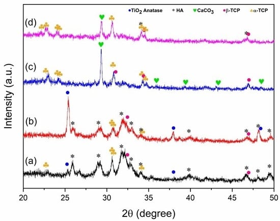 The XRD patterns of HA/TiO2 powders and their corresponding flame-sprayed coatings are shown in Figure 3. For the precursor powders (Figure 3a,b), characteristic peaks of HA were clearly detected together with α-TCP and β-TCP phases, indicating that the synthesized powders consist of a multiphase calcium phosphate mixture rather than a single-phase HA. The incorporation of TiO2 was confirmed by anatase reflections, which were more pronounced in the 5% TiO2 sample. After flame spraying (Figure 3c,d), the coatings exhibited decreased HA peak intensity and the emergence of CaCO3 reflections, consistent with phase transformation and carbonation during the high-temperature spraying process. It is plausible that in flame-sprayed HA/TiO2 coatings, localized thermal fluctuations induced by TiO2 promote HA destabilization to CaO, which subsequently carbonates to CaCO3 upon cooling. This interpretation is further supported by our previous work on flame-sprayed nano-HA coatings without TiO2, in which no CaCO3 formation was observed [24]. The contrast suggests that TiO2 plays a critical role in facilitating CaCO3 generation during the coating process. Although TiO2 incorporation facilitates partial HA transformation, CaCO3 should not be regarded as undesirable. While the higher solubility of CaCO3 may compromise the long-term stability and mechanical integrity of the coating, it can also promote rapid Ca2+ release and enhance apatite nucleation, resulting in more homogeneous mineralization during SBF immersion. Therefore, the role of CaCO3 in HA/TiO2 coatings should be considered in a balanced manner, recognizing both its potential to improve short-term bioactivity and its possible drawbacks for long-term durability. Notably, owing to its biocompatibility, biodegradability, and higher solubility, CaCO3 has been shown to accelerate ionic release and stimulate bone formation, consistent with previous reports on CaCO3–CaP biphasic systems [25,26,27]. Both archeological evidence and engineered biomaterials reinforced with CaCO3 [28] further highlight its osteoconductivity, supporting CaCO3 as a beneficial component that contributes to controlled degradation and osteointegration in HA/TiO2 coatings.