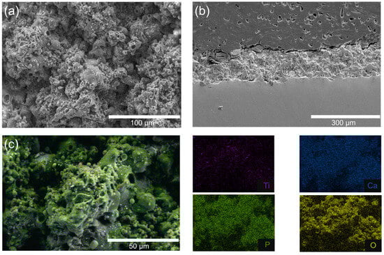 SEM images of HA/TiO2–1% coating: (a) top surface morphology, (b) cross-sectional view, and (c) corresponding EDS elemental mapping.
