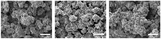 The crystalline phases of both the synthesized powders and the as-sprayed coatings were analyzed by X-ray diffraction (XRD, Rigaku SmartLab, Tokyo, Japan). Surface and cross-sectional morphologies were observed using scanning electron microscopy (SEM, TESCAN VEGA 3), while elemental composition was confirmed by energy-dispersive spectroscopy (EDS). Bioactivity was evaluated by immersing the coated substrates in simulated body fluid (SBF), prepared according to Kokubo’s protocol, for 7 and 14 days. After immersion, the surfaces were examined for apatite formation and morphological changes using SEM and EDS.