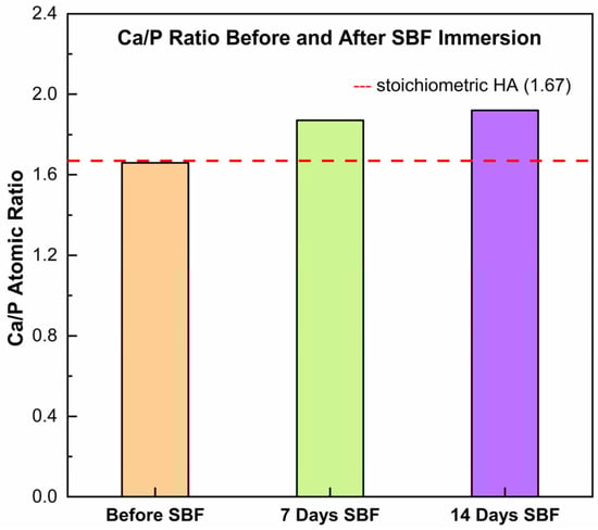 The Ca/P atomic ratio obtained by EDS (Figure 7) increased from ~1.66 in the as-sprayed coating to ~1.87 after 7 days in SBF and ~1.92 after 14 days. This progressive Ca enrichment indicates that the newly deposited phases were Ca-rich and not stoichiometric HA. One possible explanation is that carbonate present in the coating dissolved during immersion, supplying excess Ca2+ relative to phosphate uptake from the SBF. The released calcium then contributed to rapid precipitation of Ca-rich deposits (e.g., carbonated apatite or mixed CaCO3/Ca–P), which would shift the surface composition toward higher Ca/P values. Thus, the rising Ca/P ratio measured by EDS may reflect a carbonate-driven mineralization pathway, in which dissolution–reprecipitation processes favor the accumulation of Ca-rich layers at the coating surface under SBF conditions.