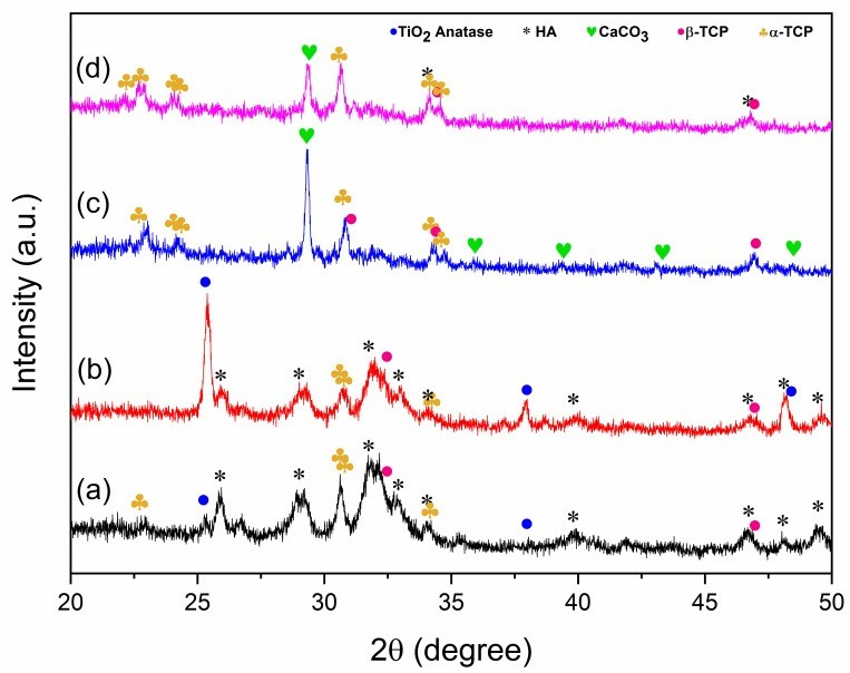 - Henao, J.; Sotelo-Mazon, O.; Giraldo-Betancur, A.L.; Hincapie-Bedoya, J.; Espinosa-Arbelaez, D.G.; Poblano-Salas, C.; Cuevas-Arteaga, C.; Corona-Castuera, J.; Martinez-Gomez, L. Study of HVOF-Sprayed Hydroxyapatite/Titania Graded Coatings under in-Vitro Conditions. J. Mater. Res. Technol. 2020, 9, 14002–14016. [Google Scholar] [CrossRef]