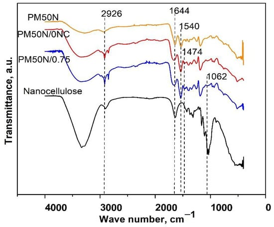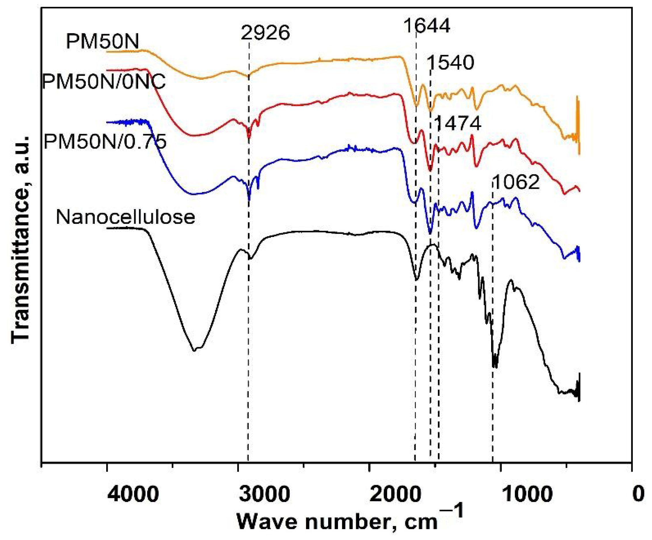 Characteristic bands of PMAA were observed in the FTIR spectra of PM50N, PM50N/0NC, and PM50N/0.75NC: the wide band from 3550 to 3000 cm