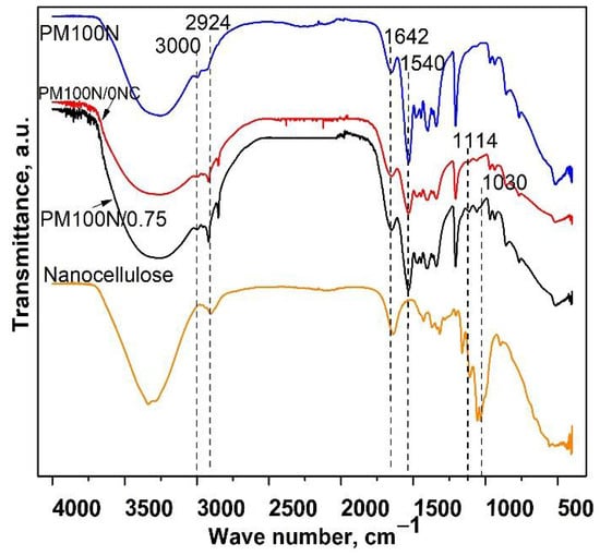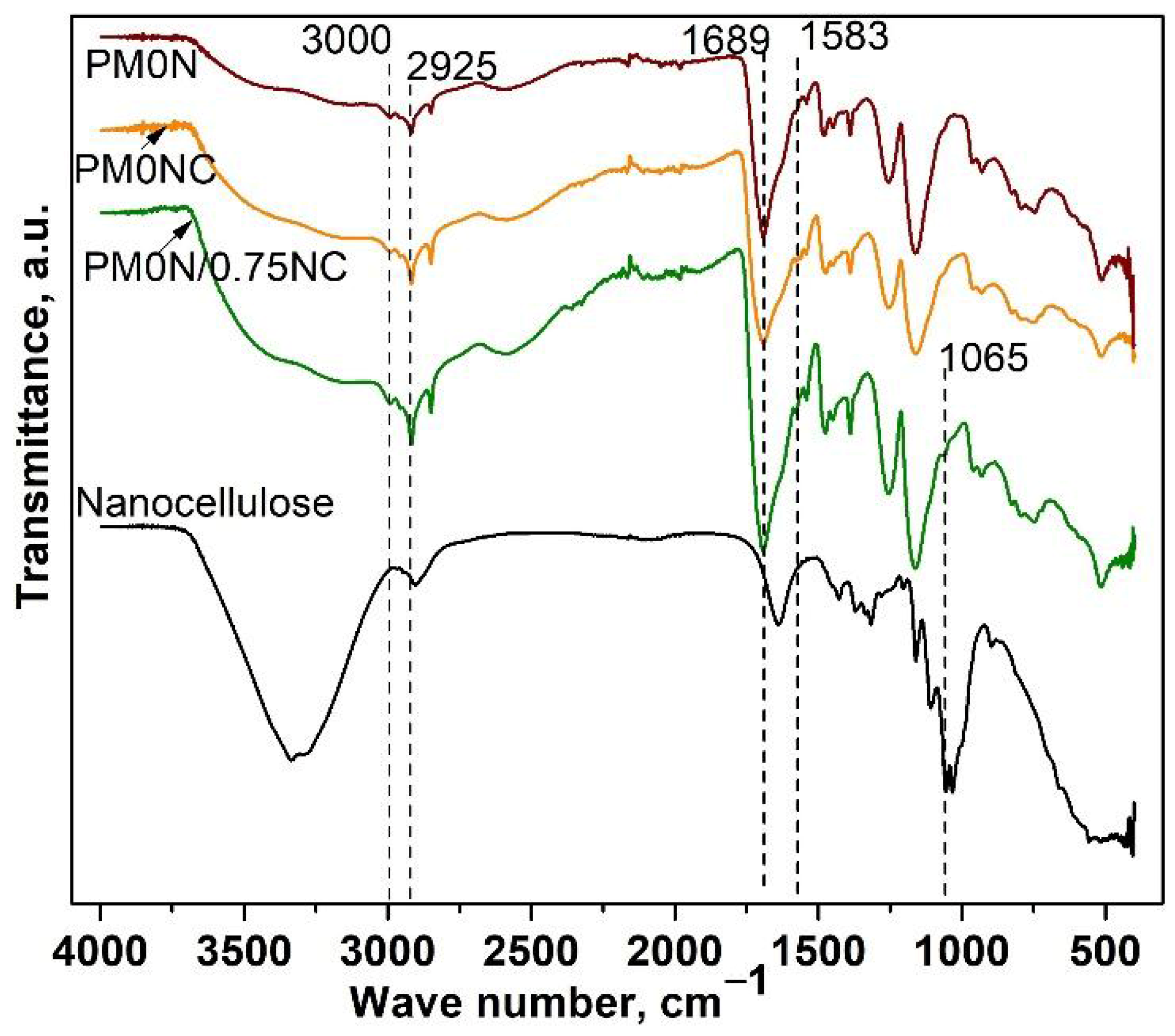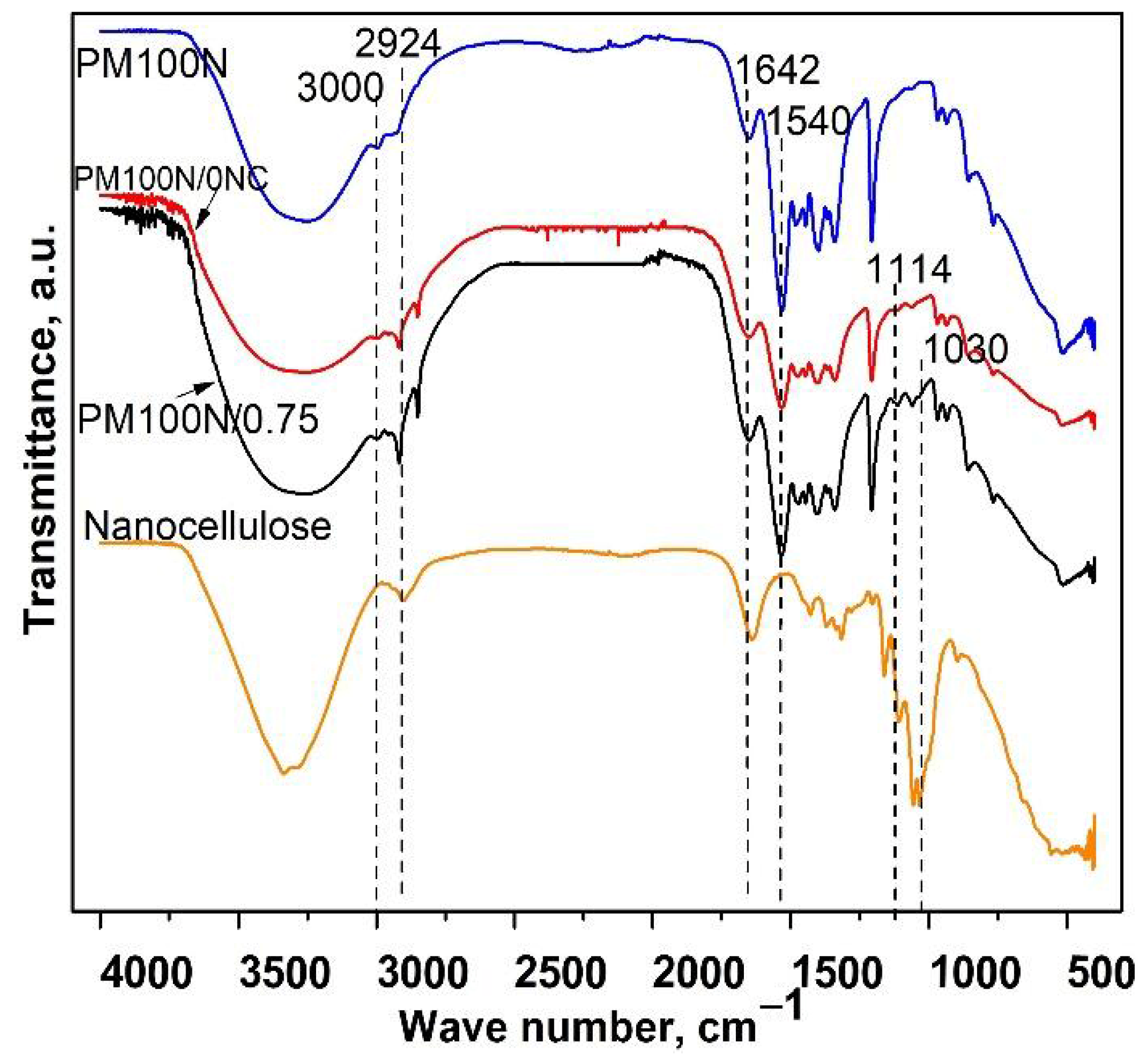 FTIR spectra of the PM100N, PM100N/0NC, and PM100N/0.75NC samples showed the presence of characteristic bands of PMAA: the wide band from 3550 to 3000 cm