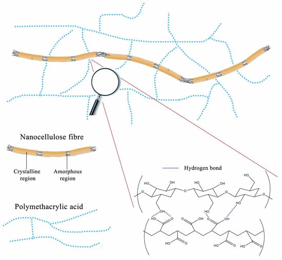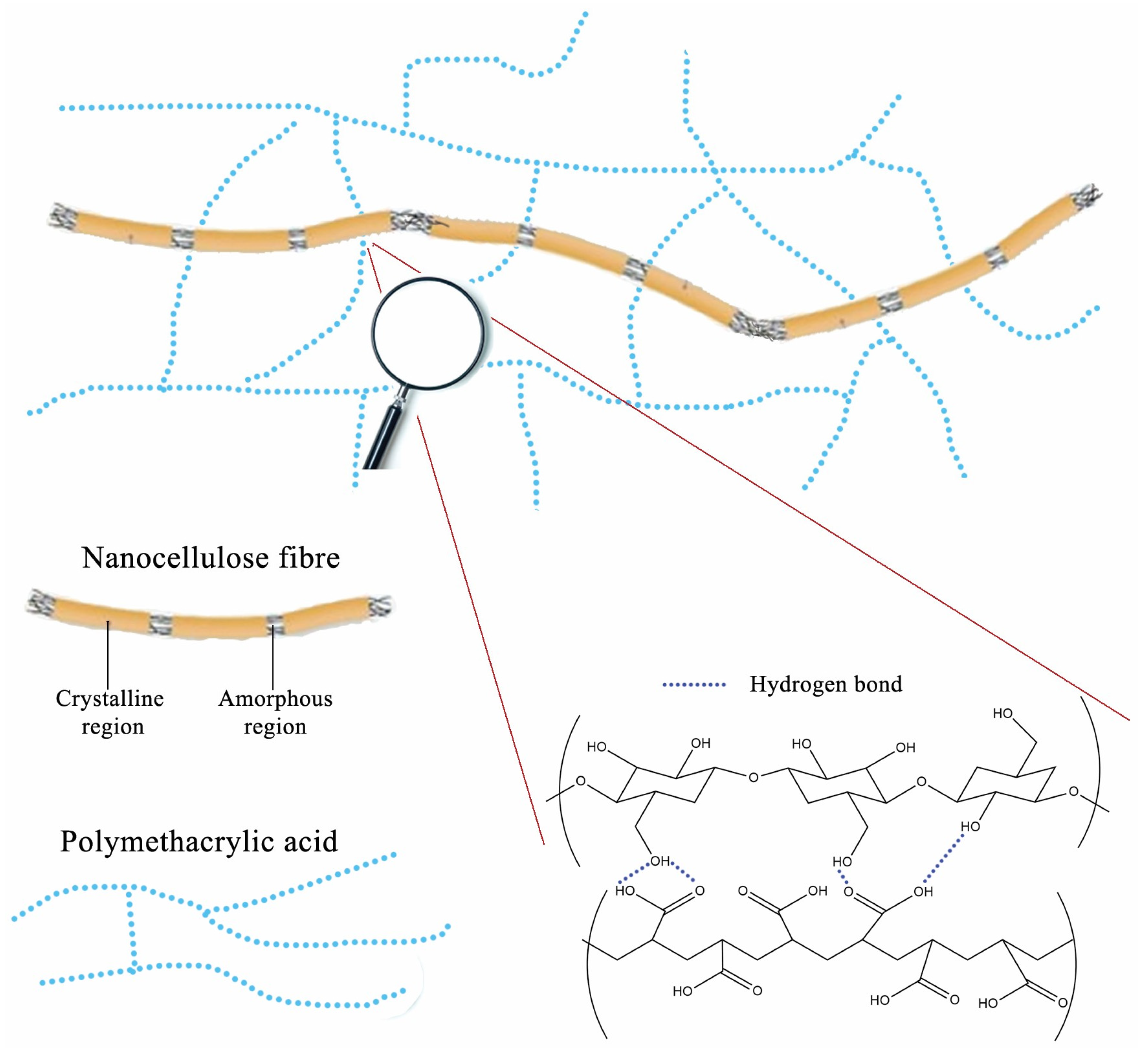 The schematic illustration of the proposed interactions between nanocellulose fibers and polymer network in PM0N/xNC hydrogel is presented in