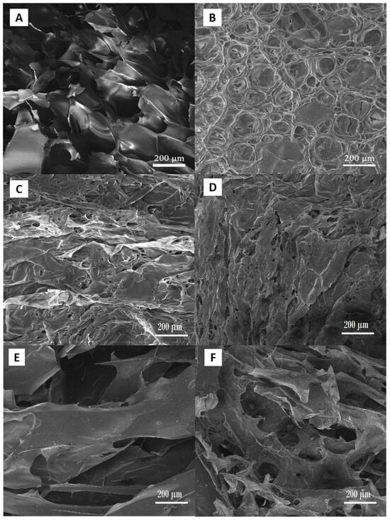 27]. Individual NC fibrils were not distinctly resolved in SEM micrographs captured at 200 µm scale; however, a clear trend emerged: with increasing NC mass fraction, amplified surface roughness of the pore walls was observed. This roughening effect likely stems from NC fibrils accumulating near the polymer matrix interface, producing a texturally richer morphology not visible at lower magnification but evident as increased microscale asperities under SEM.